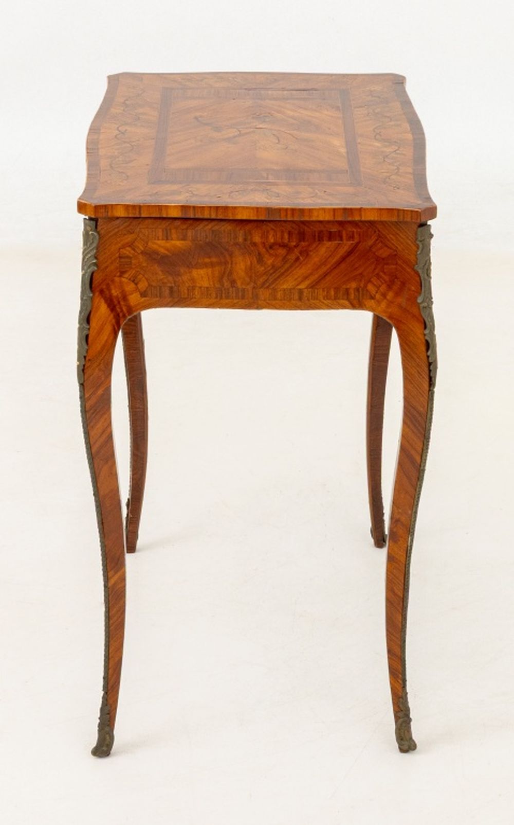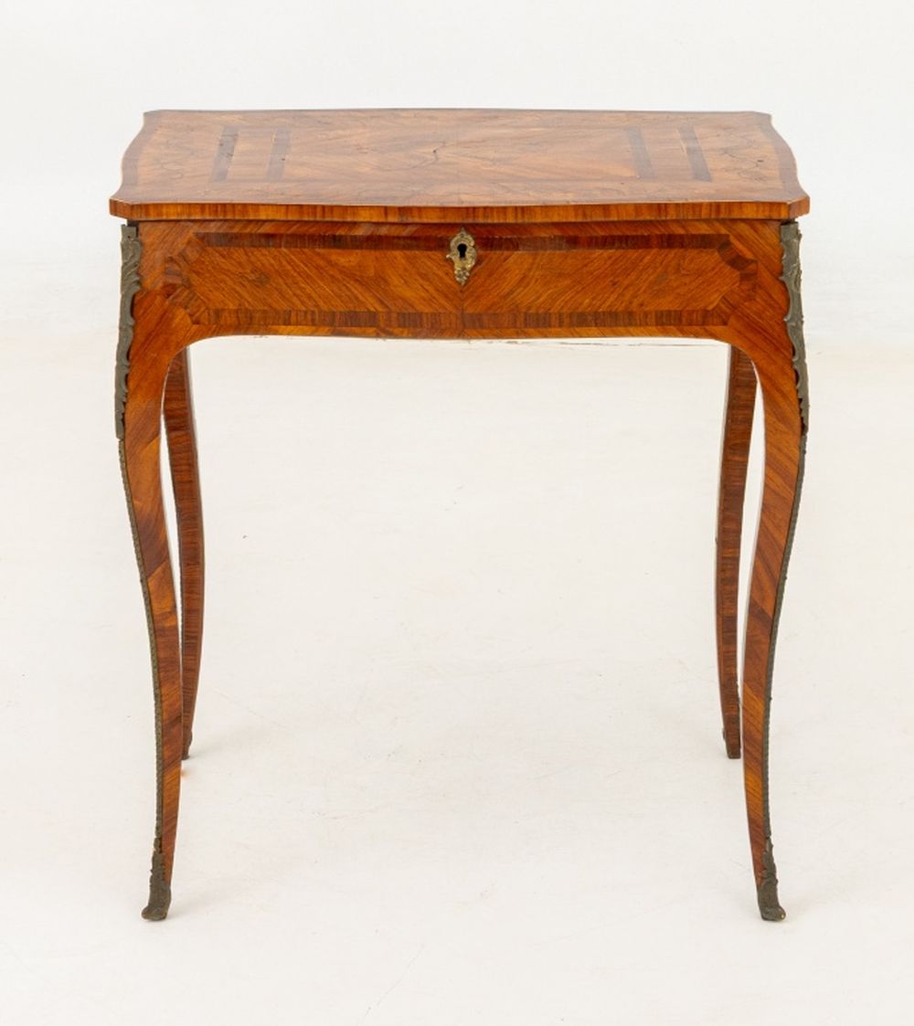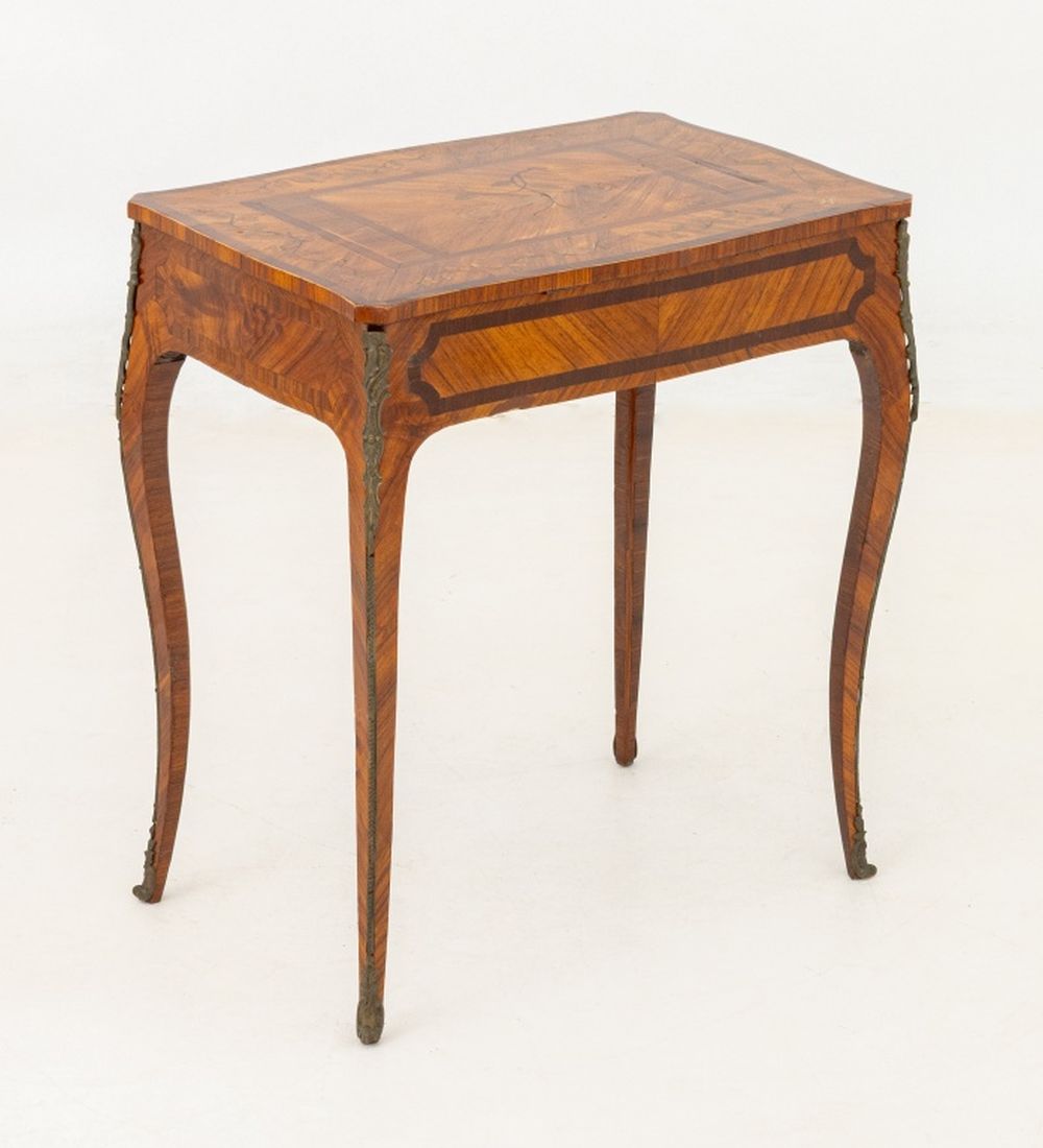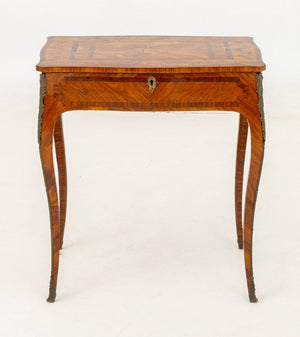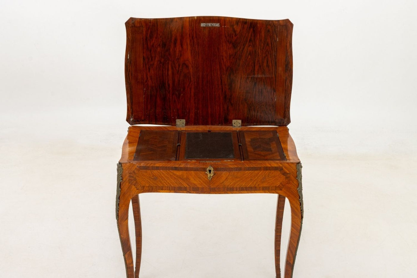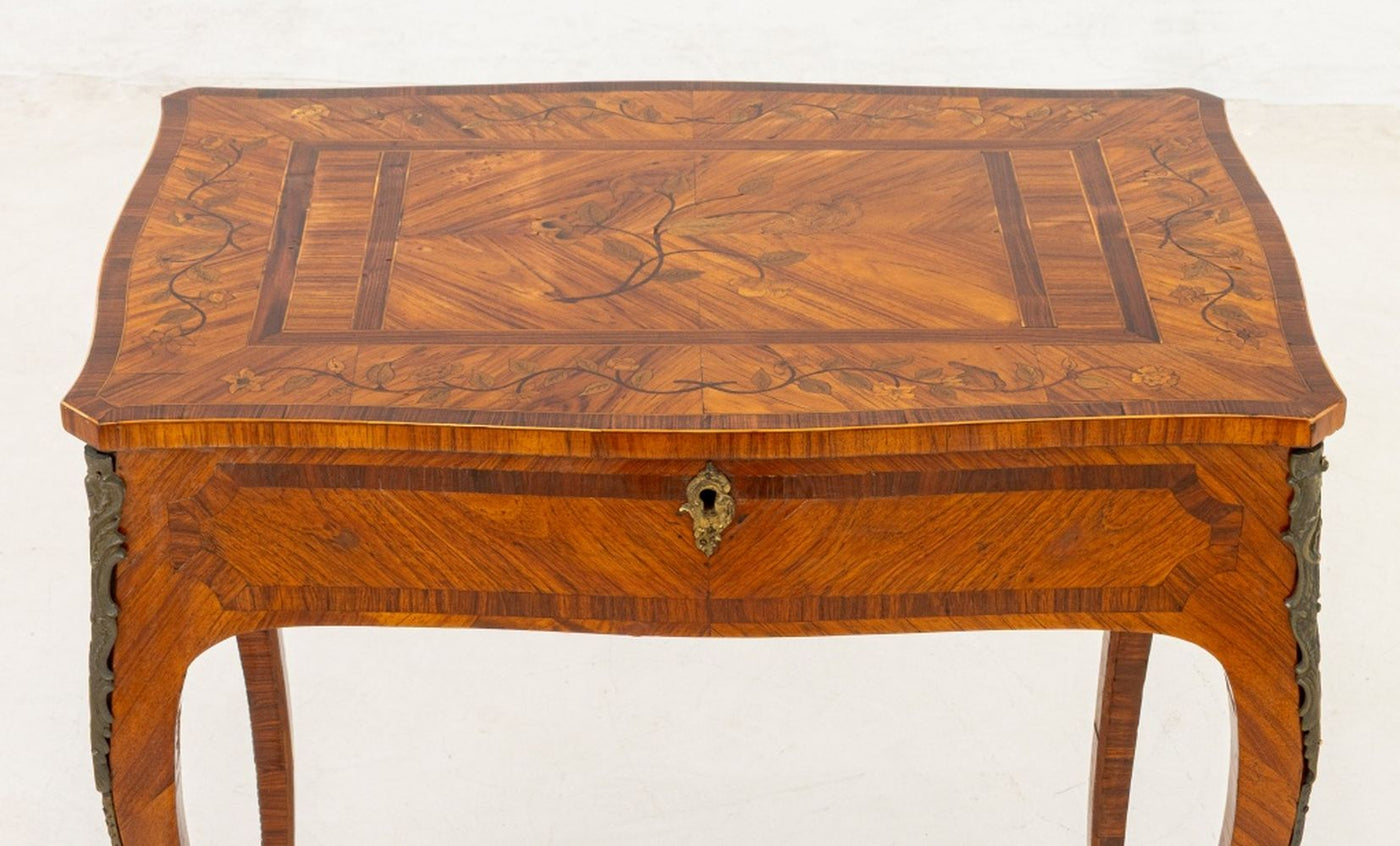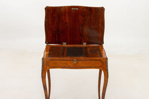 Louis XV Kingwood Parquetry Poudreuse, 18th century, rectangular shape with serpentine edge, veneered crossbanded top with floral spray, lifting open to a fitted interior with compartments, on slight cabriole legs with gilt bronze elements. 27.5" H x 25" W x 16.75" D. Provenance: From a New York City Collection. Keywords: French Period Furniture, Mobilier Francais, Powder Room Desk, Vanity table, Writing Table, Decorator Style, Antique Furniture, Decorative Arts