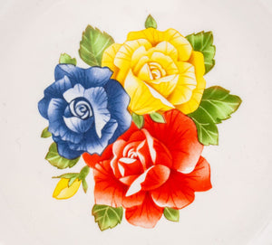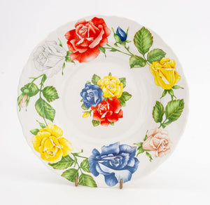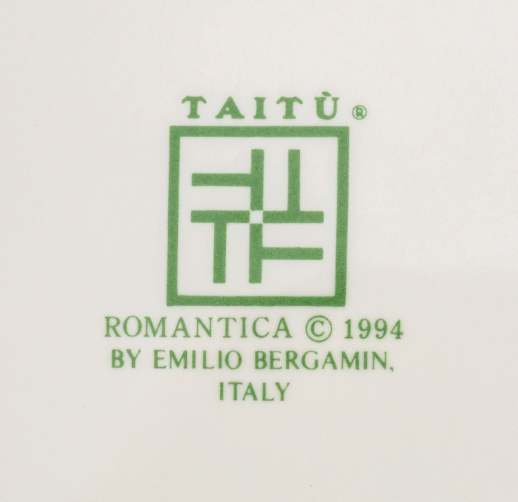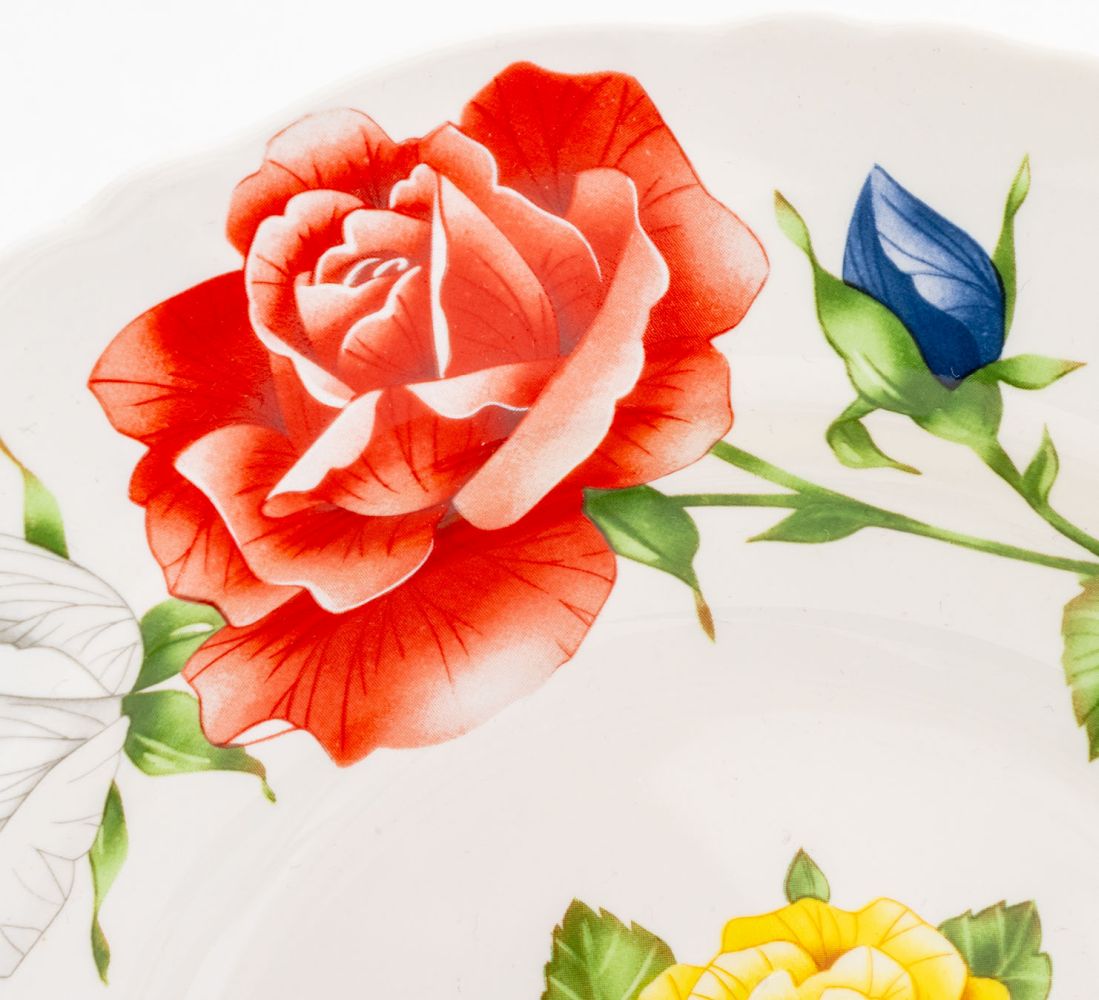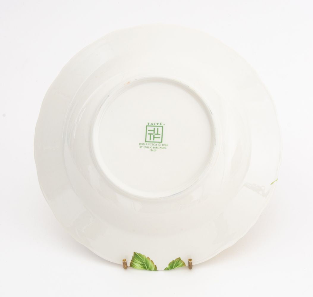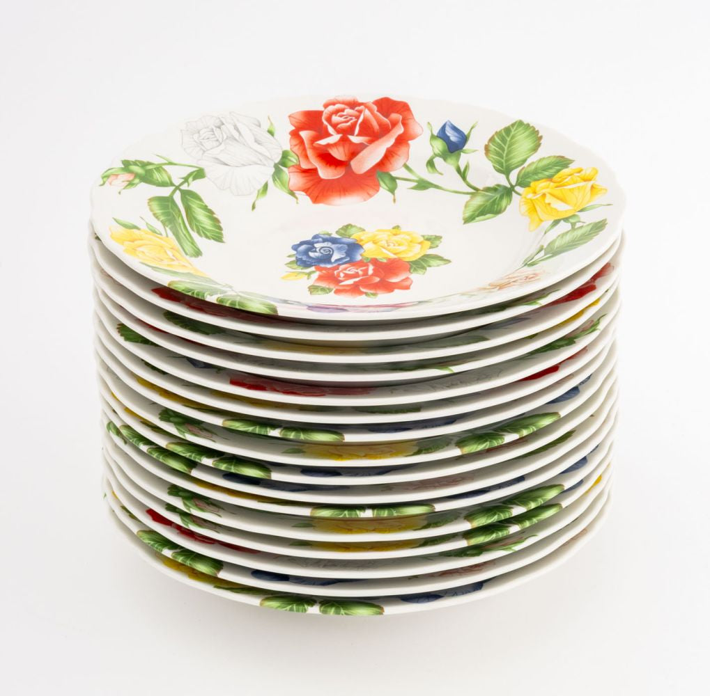 Set of 16 Emilio Bergamin for Taitu "Romantica" Porcelain Soup Bowls, 1994, each marked. 9.25" Diameter x 1.5" H. Provenance: From a Long Island Estate. Keywords: Designer, Porcelain, Italian ceramics, Italy, Tableware, Service, Serving, Chargers, Roses, Flowers, Floral motif, Polychrome, Place setting, Decorative Arts