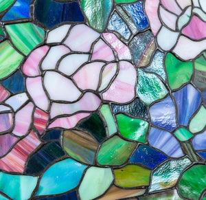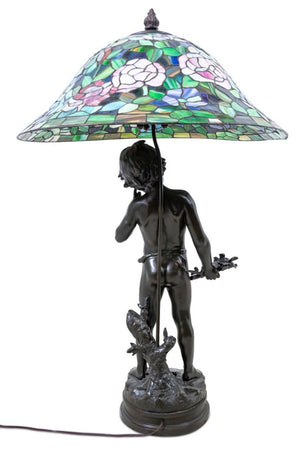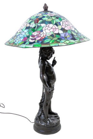 After Auguste Moreau (French, 1834-1917) Patinated Bronze and Leadlight Cherub Table Lamp, after a model by Auguste Moreau, signed to the base "Aug Moreau" and "Collection Francaise/Made in USA" foundry cachet. 42.5" H x 26.5" W x 26.5" D. Keywords: French Art, Lighting, Putto, Putti, Cherub, Cupid, Stained Glass, Belle Epoque, Figural, Floral, Birds, Love, Decorative Arts