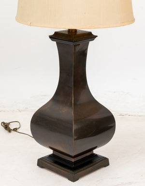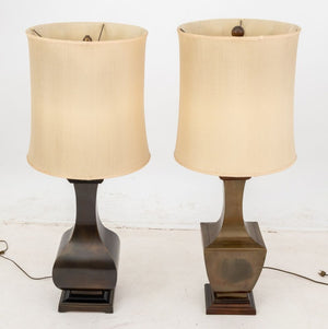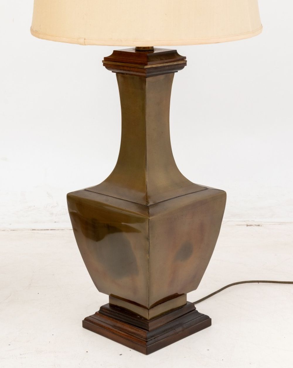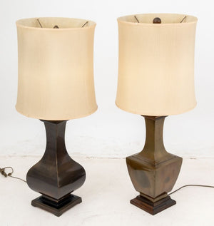 Assembled Pair of Vasiform Brass Table Lamps, with beige fabric shades, one with spherical finial and atop a wood base. Overall: 42.5" H x 17.25" Diameter. Provenance: From an East Village Estate. Keywords: Lighting, Metalwork, Chinoiserie, Chinese Style, Vase shaped, Accent lamps, Interior design, Decorative Arts