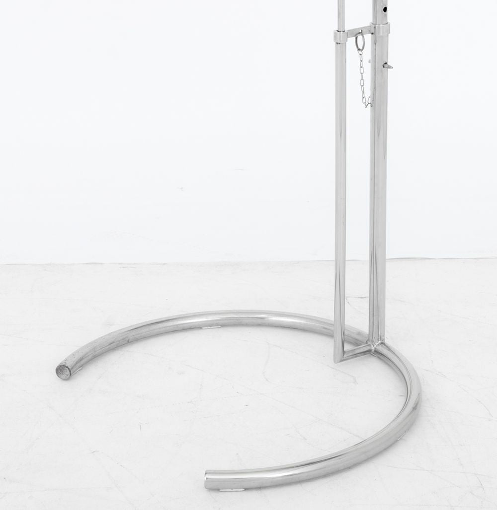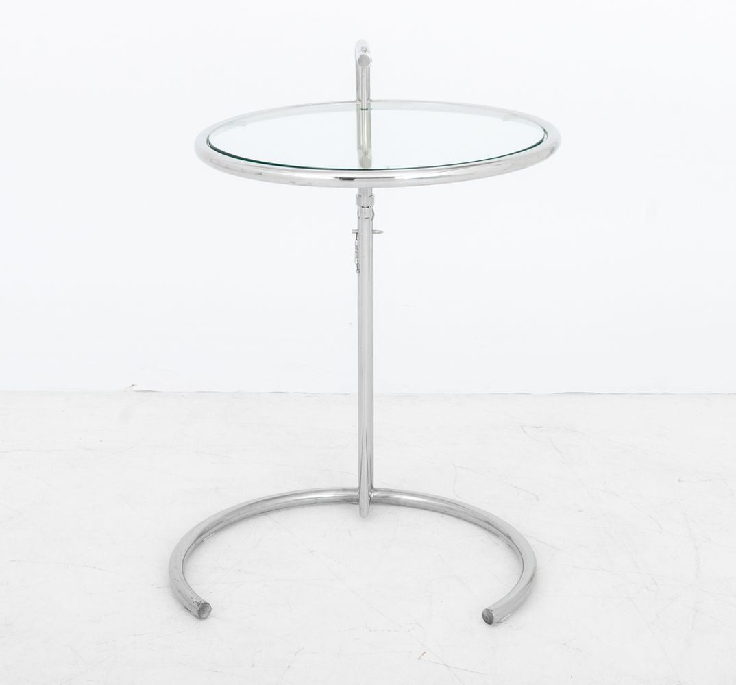 Eileen Gray Adjustable "E 1027" Glass Top Chrome-Plated Side Table, on half circle base. 29.5" H x 20" Diameter. Provenance: From a New York City Area Collection. Keywords: Furniture, Accent table, Cocktail table, Designer, Interior design, Decorative Arts, Vintage