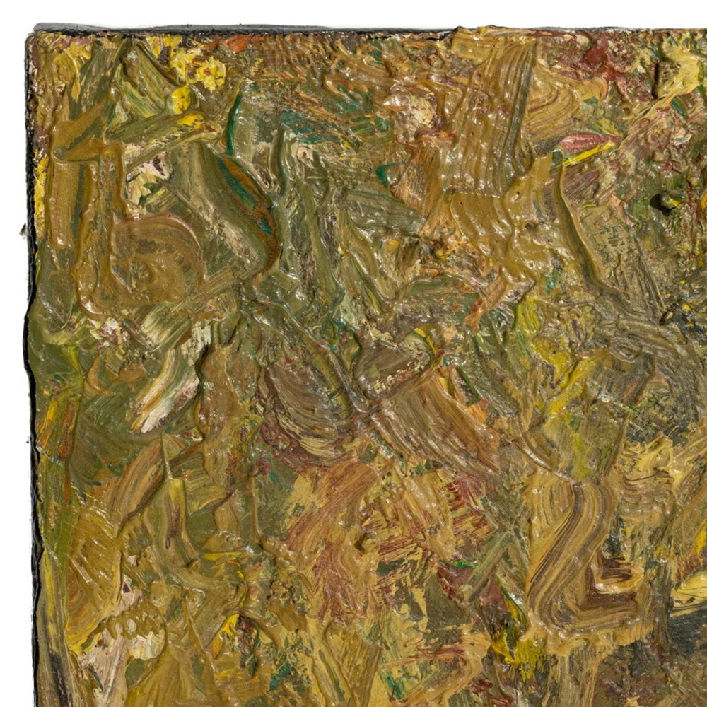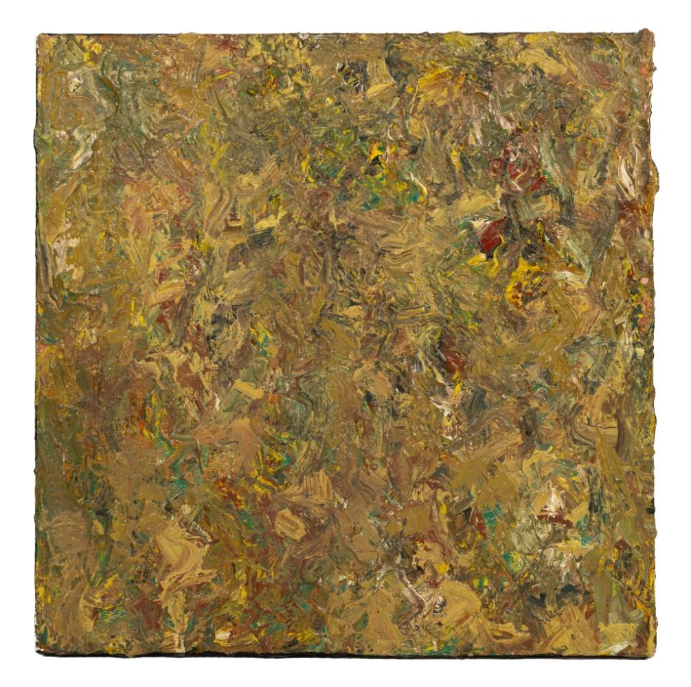Andy Miller (American, b. 1950), Abstract Composition, Oil on Canvas, impasto details, light green-brown with reddish hues, unsigned, artist's studio stamp to verso, unframed. 12.25" H x 12.25" W. Provenance: From the Studio of Andy Miller. Keywords: Painting, Works on Canvas, Abstraction, Abstract Expressionist, Abstract Expressionism, AbEx, Post-War and Contemporary Art, Polychrome, 20th Century School, Circle of Milton Resnick and Pat Passlof