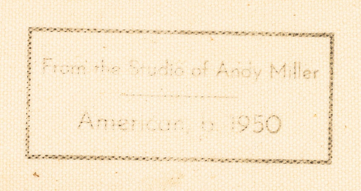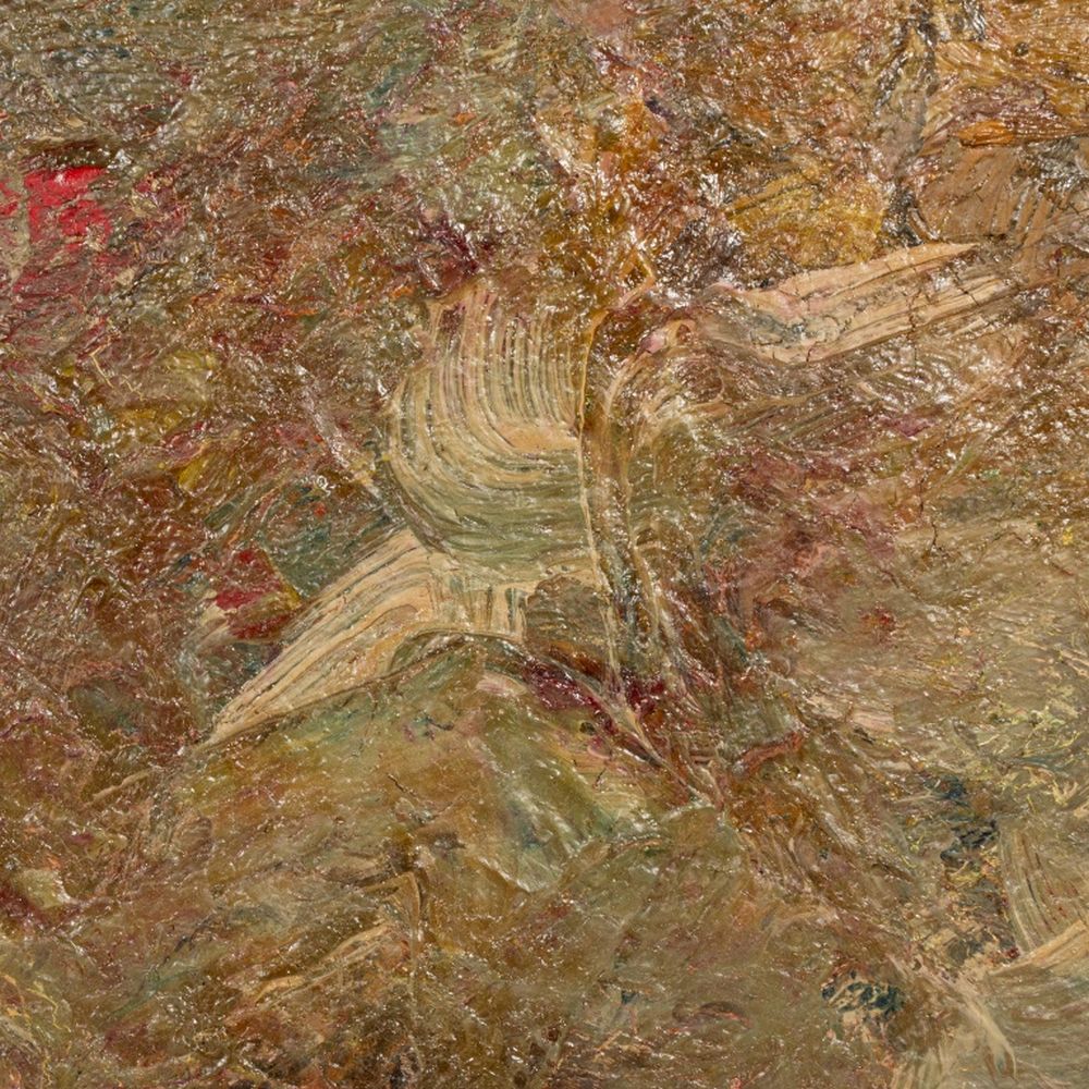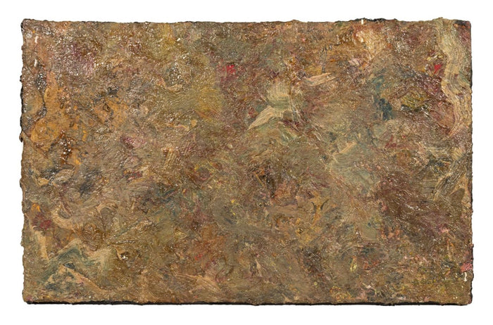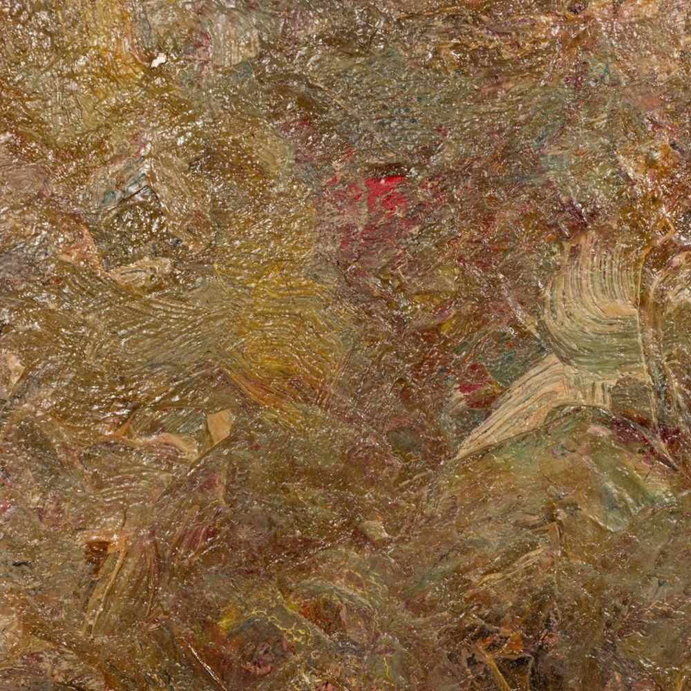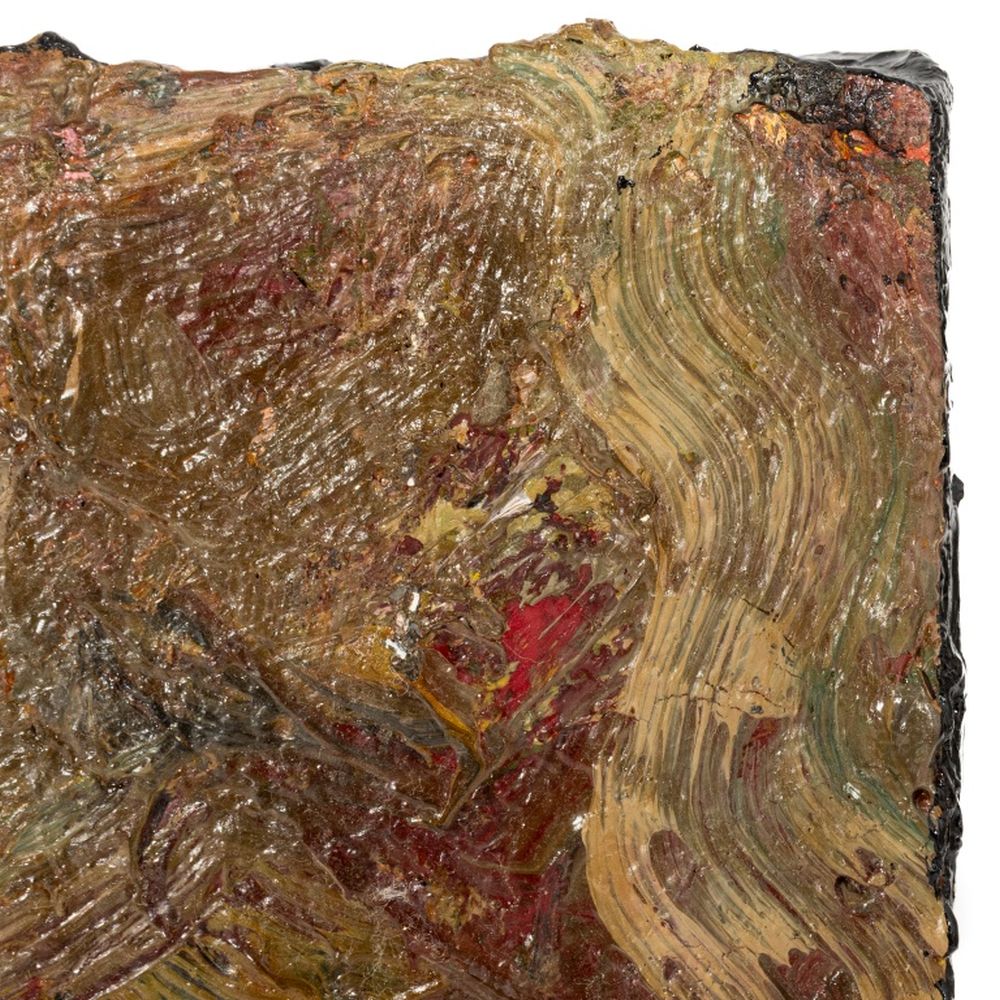 Andy Miller (American, b. 1950), Abstract Composition, Oil on Canvas, impasto details, cool green brown with red hues, unsigned, artist's studio stamp to verso, unframed. 10.25" H x 16.25" W. Provenance: From the Studio of Andy Miller. Keywords: Painting, Works on Canvas, Abstraction, Abstract Expressionist, Abstract Expressionism, AbEx, Post-War and Contemporary Art, Polychrome, 20th Century School, Circle of Milton Resnick and Pat Passlof