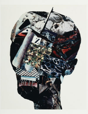 Anne Sager (American, 1930-2024), "Angst", Chromogenic Print on Paper, photo collage composition in the silhouette of a person's head, with artist's estate stamp to verso, unframed. Image: 20" H x 16.5" W; sheet: 22" H x 17" W. Provenance: From a 35 East 75th Street Estate. Keywords: Photography, Prints, Multiples, Figural, Help, Trash, Garbage, Junkyard, Environmentalism, Green, Eco friendly, Abstract, Abstraction, Women Artists, Contemporary Art
