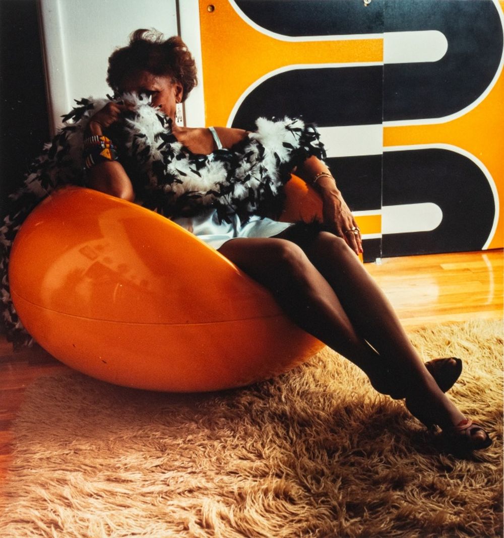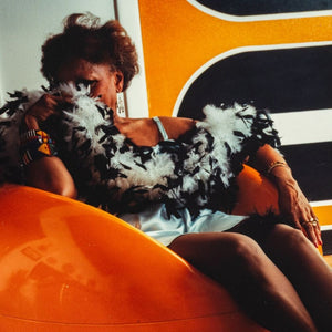 Anne Sager (American, 1930-2024), Seated Female Figure, Color Photograph, Chromogenic Print, from the "Women Over 50" series, woman in yellow mod chair, draped in feather boa, stamped “Anne Sager 19” to verso, unframed. Image: 7.5" H x 7" W; sheet: 10" H x 8" W. Provenance: From a 35 East 75th Street Estate. Keywords: Color Photography, Prints, Multiples, Portrait, Portraiture, Intimate, Sensual, Vanity, Women Artists, Contemporary Art