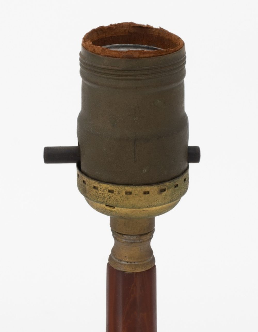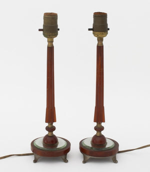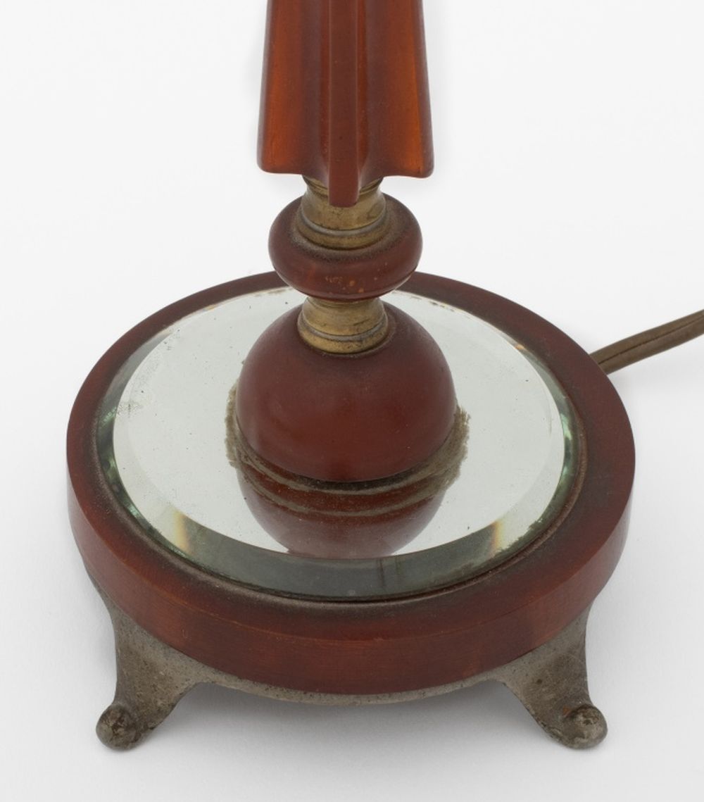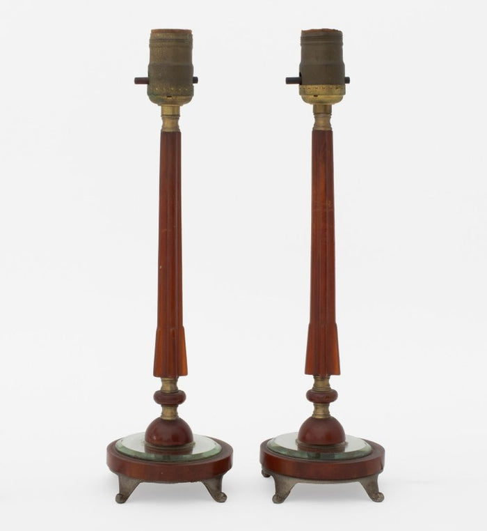 Pair of Art Deco Amber Bakelite and Glass Table Lamps, fluted tapering column surmounting a circular beveled mirror base, mounted on scrolled pewter feet. 14" H x 4.75" Diameter. Provenance: From a New York City Collection. Keywords: Lighting, Antique, Illuminate, Desk lamp, American Classic, Art Deco Period, Modernist, Modernism,  Office, Catalin, Interior design, Decorative Arts