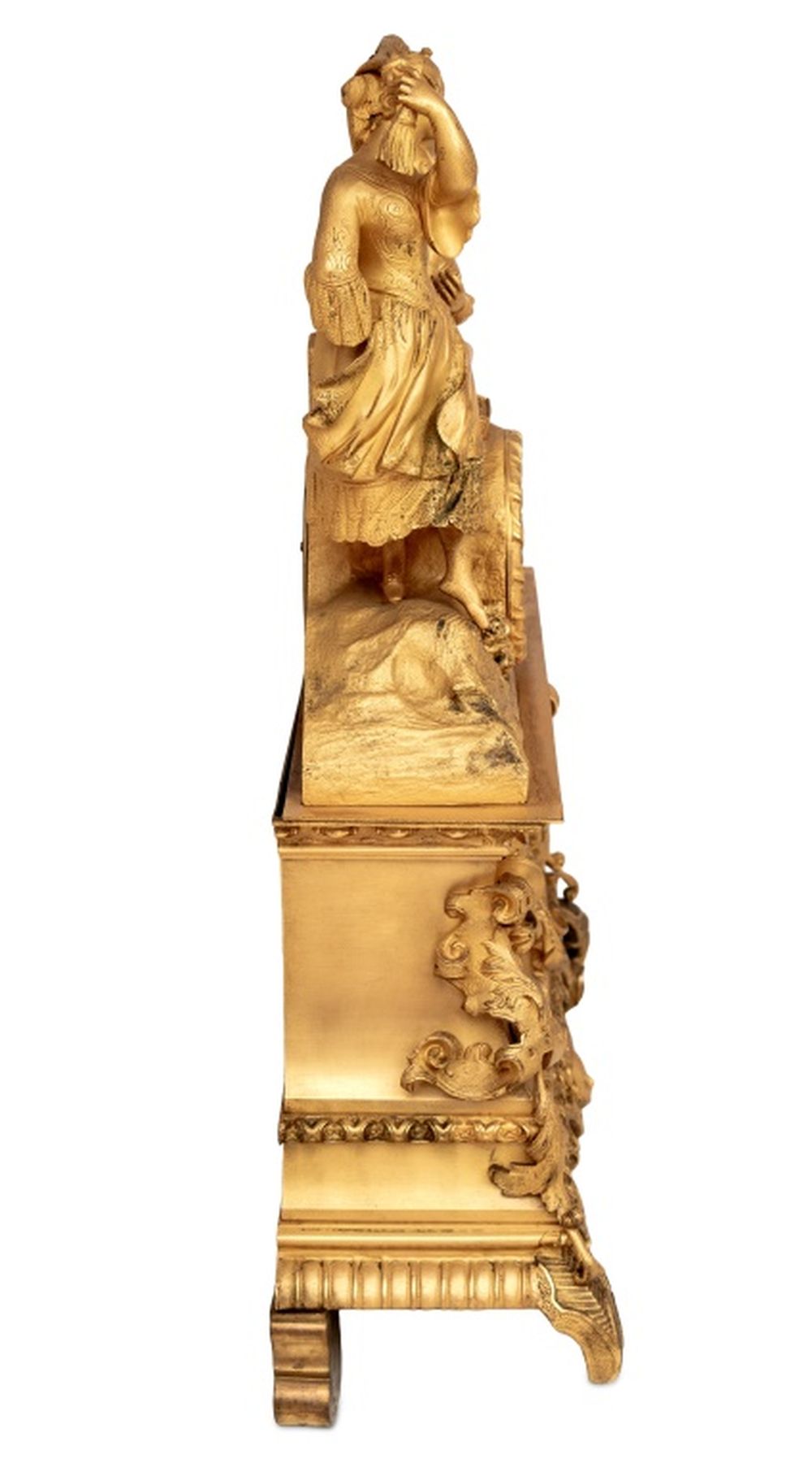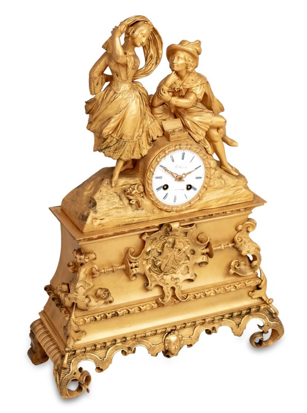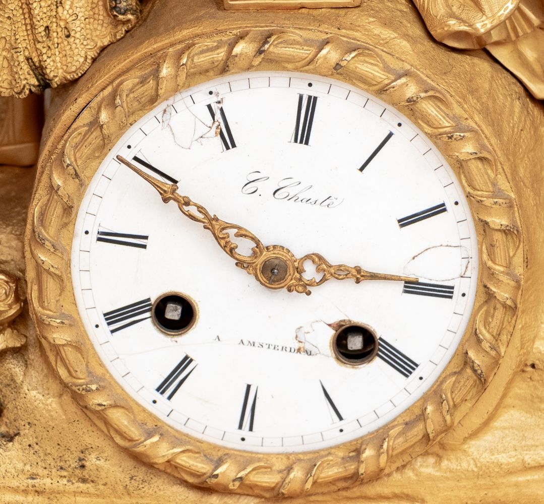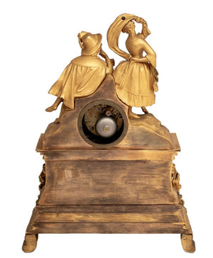 Charles X Gilt Bronze Figural Clock, circa 1830, the circular enamel dial signed "C. Chaste a Amsterdam", the movement strike on bell, surmounted by a courting couple, on a strapwork mounted graduated plinth and scrolled feet. 20.5" H x 14.5" W x 5.5" D. Keywords: Mantel Clock, French Empire, Restauration, French Romanticism, Horologe, Horology, Timepiece, Time keeping, Ormolu, Interior Design, Decorative Arts