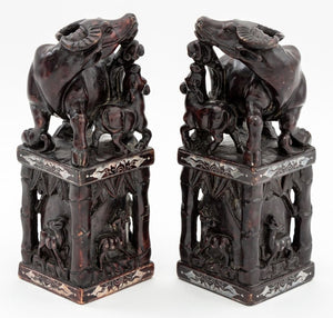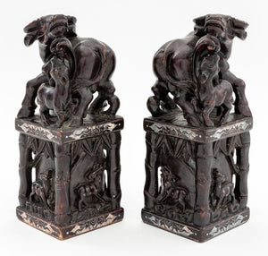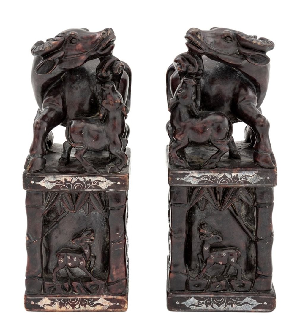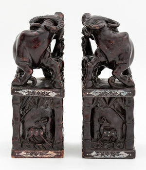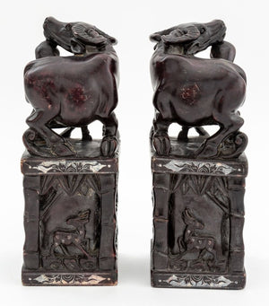 Pair of Chinese Carved Hardstone Large Chop Seals, the reticulated bases with stag vignette reliefs, the upper portions depicting an ox mother and child.