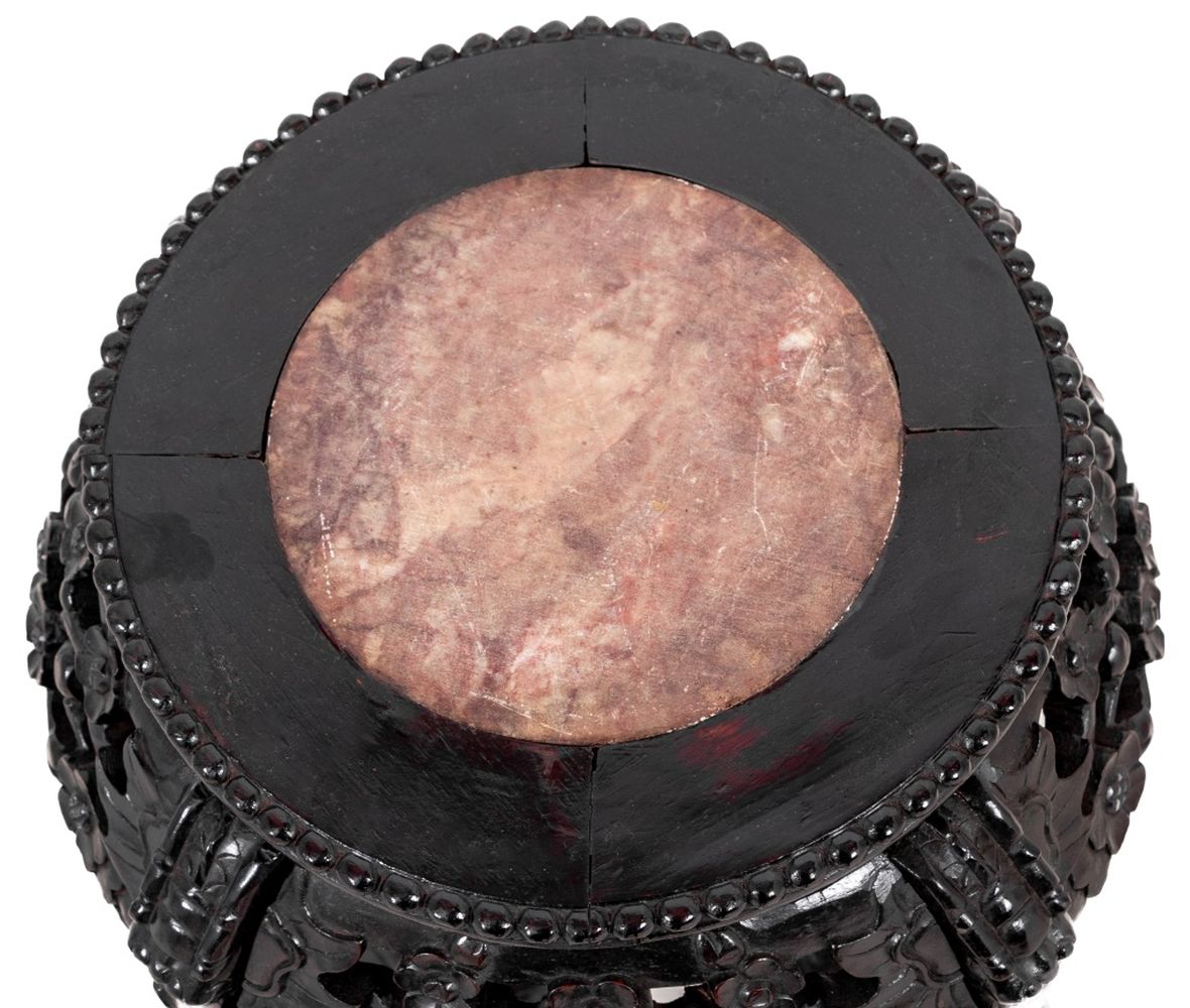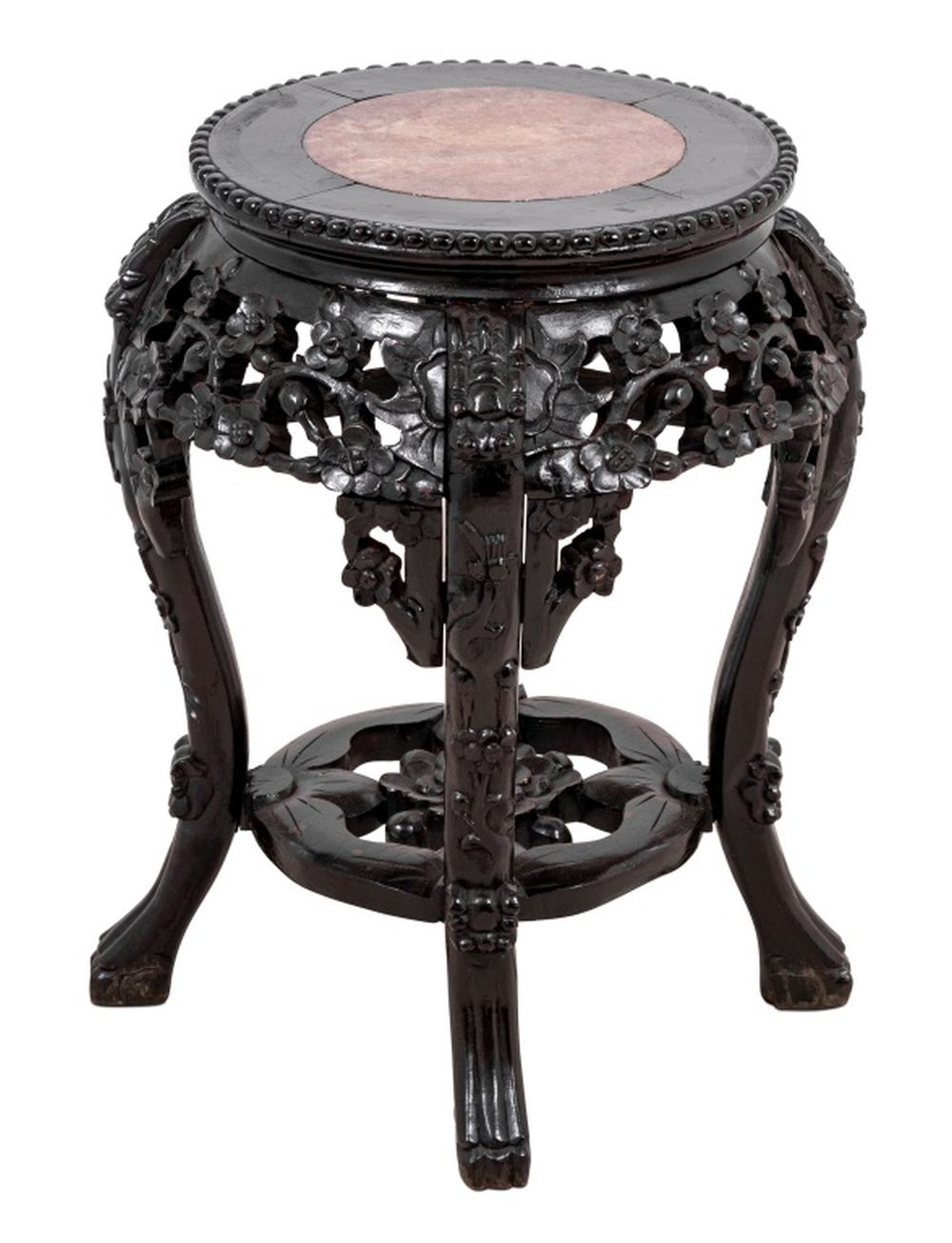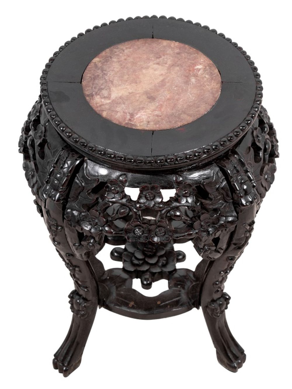 Chinese Carved Hardwood and Marble Pedestal Low Table, late 19th century, ornately carved on scrolled legs joined by an undertier. 18" H x 13" W x 13" D. Keywords: Asian Arts, Antique Furniture, Lamp table, Side table, Display stand, Sculpture gallery, Plant stand, Specimen Marble, Interior design, Decorative Arts