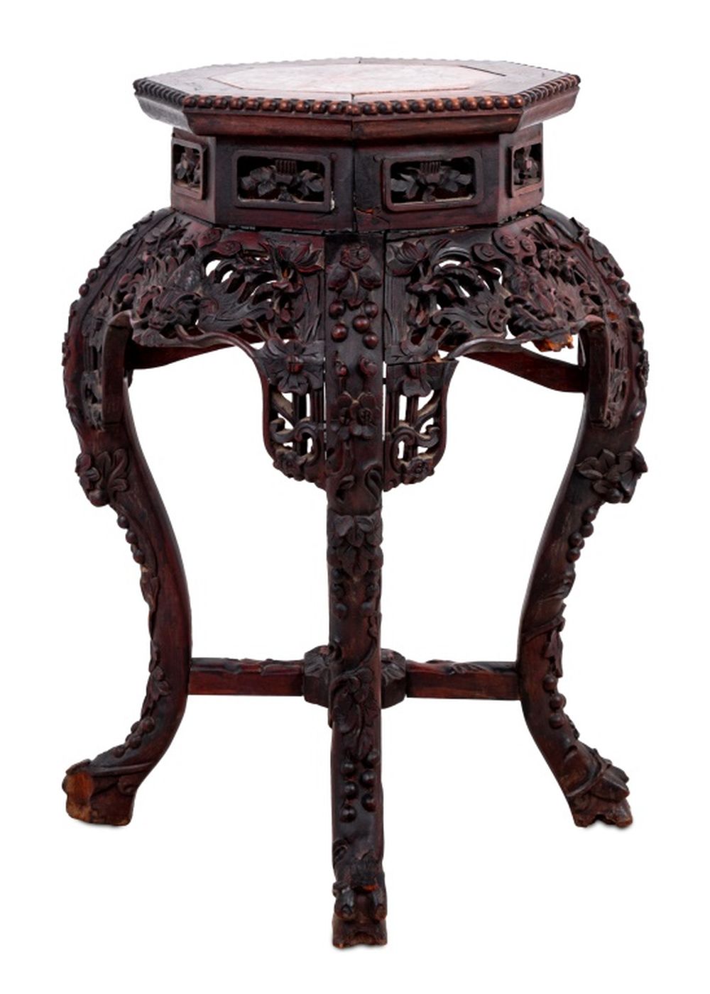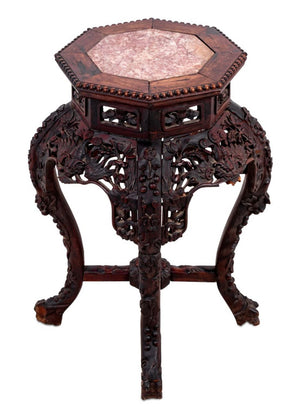 Chinese Carved Hardwood and Marble Pedestal Table, late 19th century, the octagonal inset marble top above an intricately carved frieze, on scrolled legs joined by an X-form stretcher. 25" H x 17" W x 17" D. Keywords: Asian Arts, Antique Furniture, Lamp table, Side table, Display stand, Sculpture gallery, Plant stand, Interior design, Decorative Arts