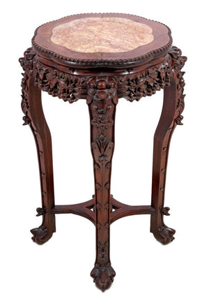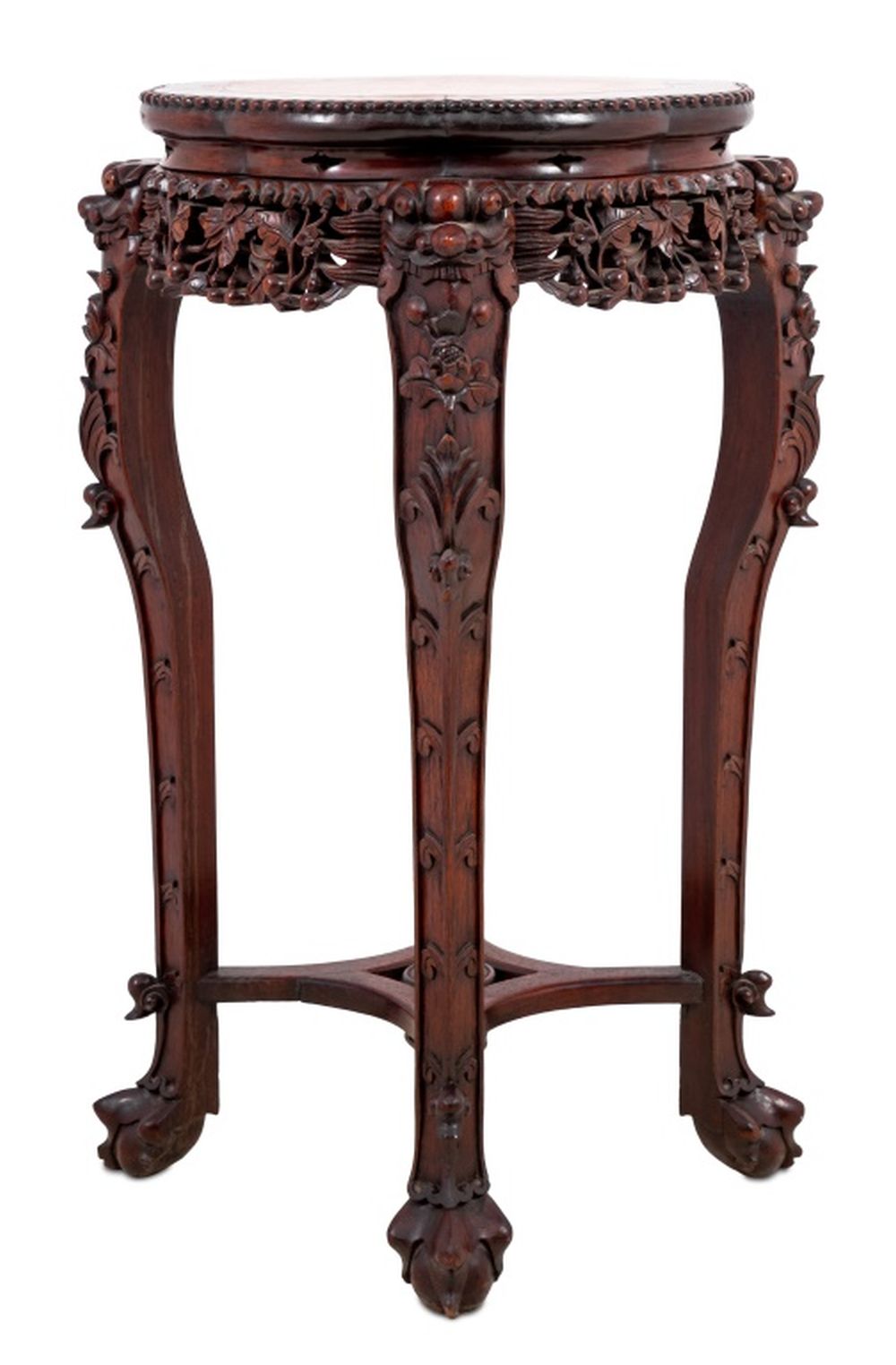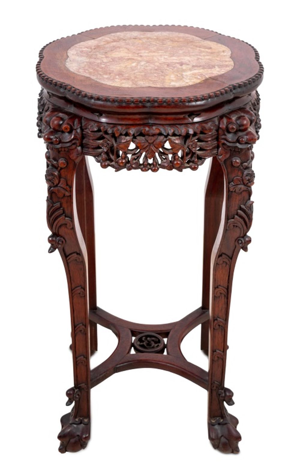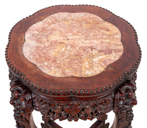 Chinese Carved Hardwood and Marble Pedestal Table, late 19th century, the lobed inset top above a carved frieze, and legs on claw and ball feet, joined by an X-form stretcher. 32" H x 17" W x 17" D. Keywords: Asian Arts, Chinese Furniture, Antique Furniture, China, Lamp table, Side Table, Display stand, Sculpture gallery, Plant stand, Interior Design, Decorative Arts