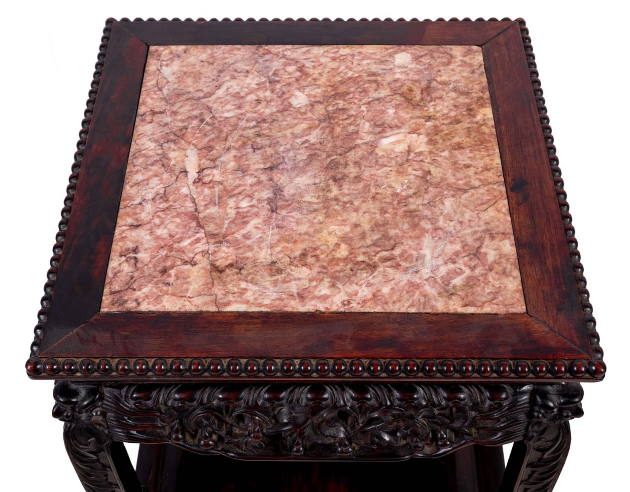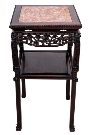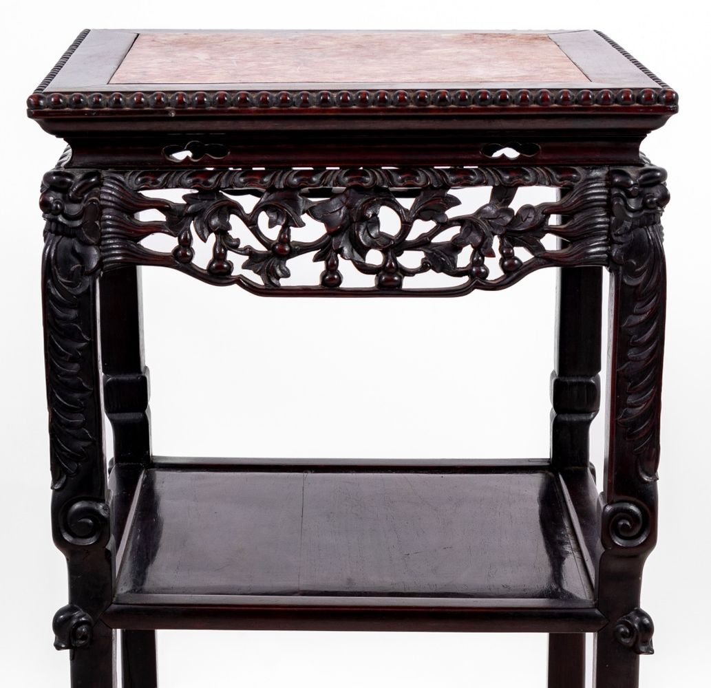 Chinese Carved Hardwood and Marble Two Tier Pedestal Table, late 19th century, the square inset top above a carved frieze, tall legs on claw and ball feet, joined by an undertier. 32" H x 16.5" W x 16.5" D. Keywords: Asian Arts, China, Antique Furniture, Lamp table, Side Table, Display stand, Sculpture gallery, Plant stand, Interior design, Decorative Arts
