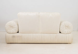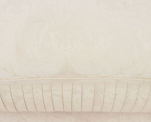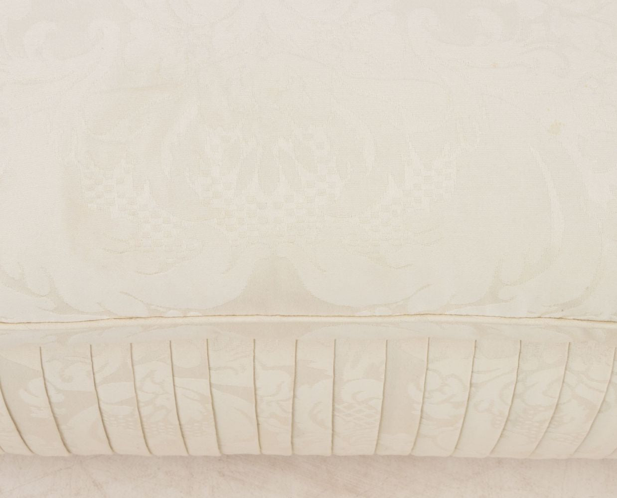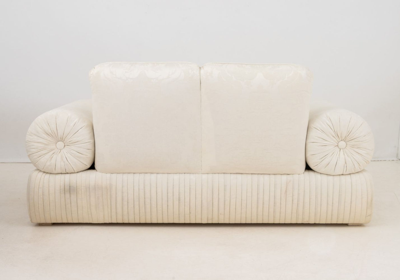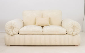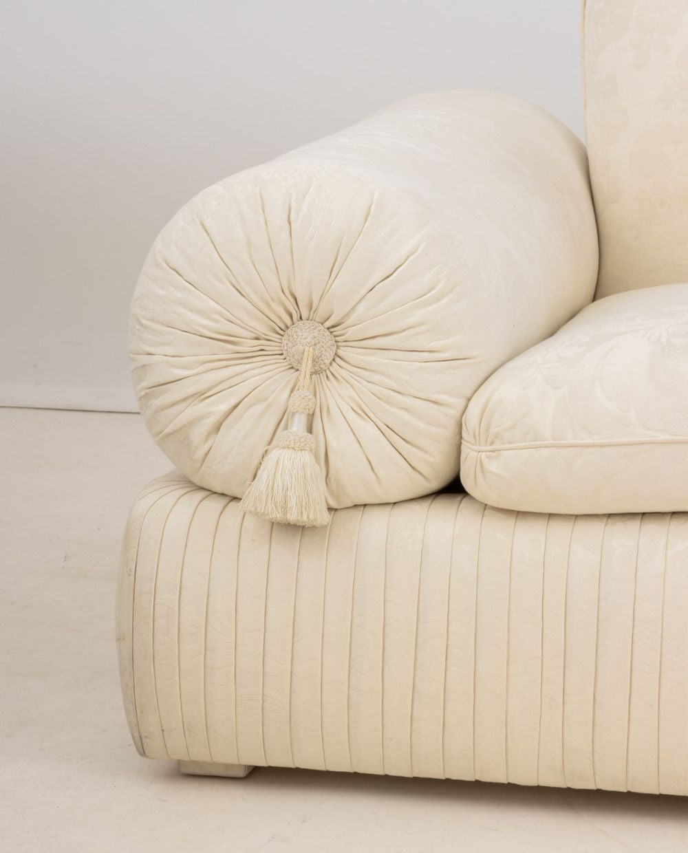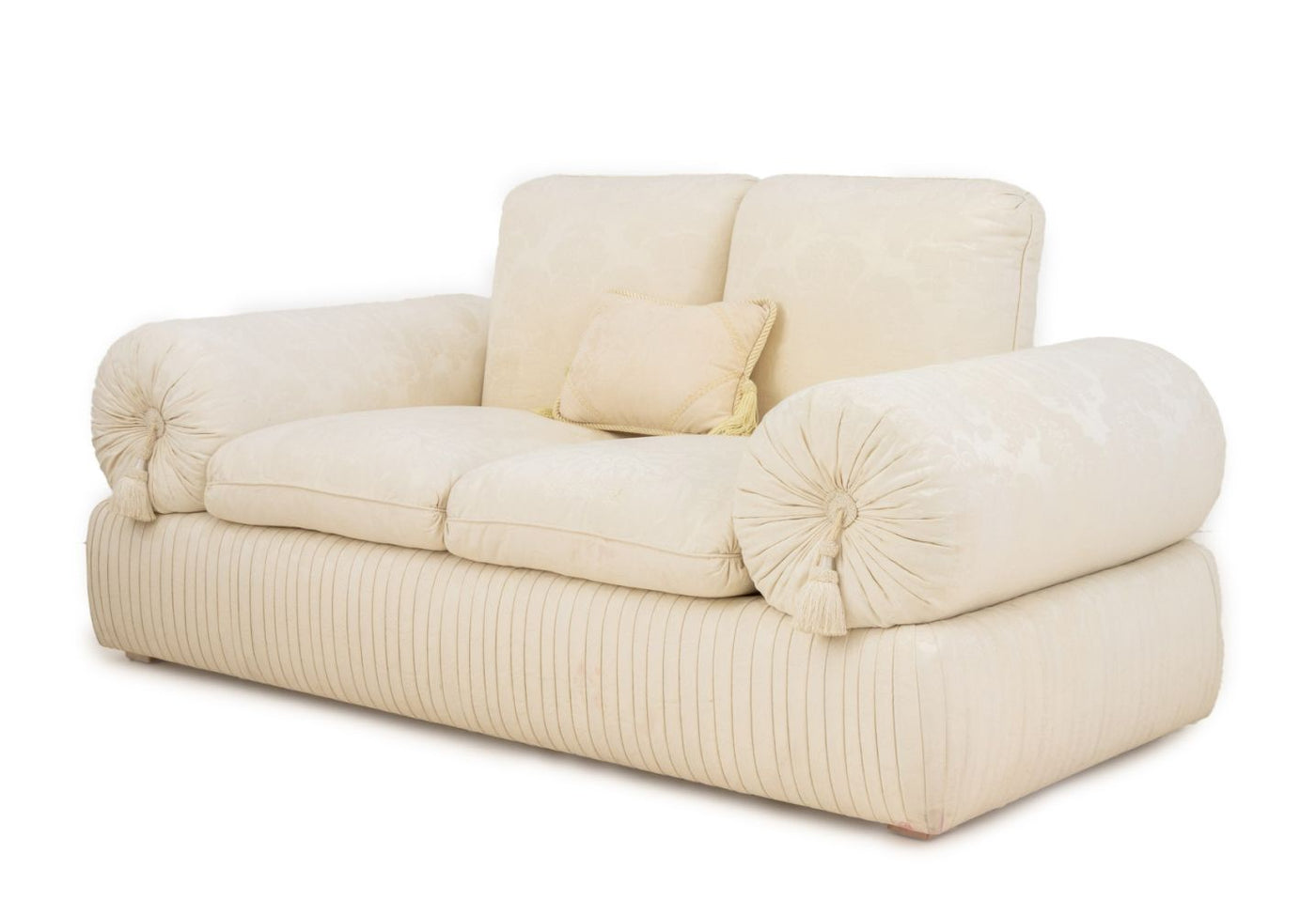 Cream Damask Upholstered Loveseat Sofa, with matching pillow. 31" H x 66" W x 34" D; seat: 18" H. Provenance: From an 880 Fifth Avenue Collection. Keywords: Vintage Furniture, Seating, Couch, Two-seat sofa, Floral pattern upholstery, Interior design, Decorative Arts