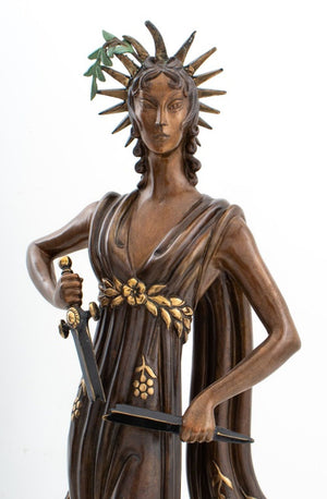 Erte (Romain de Tirtoff, Russian/French, 1892-1990) "Peace" Patinated Bronze Sculpture, 1984, signed "Erte" to verso and stamped in cast "232/500 UM / FINE ART ACQUISITIONS / 1984". 27" H x 11.25" W x 5" D. Provenance: From the collection of the publisher. Keywords: Art Deco Revival, Dyansen Gallery, Conker Foundry, Statue, Figural, Figurative, Female Figure, Woman, Allegorical, Allegory, Personification, Contemporary Art