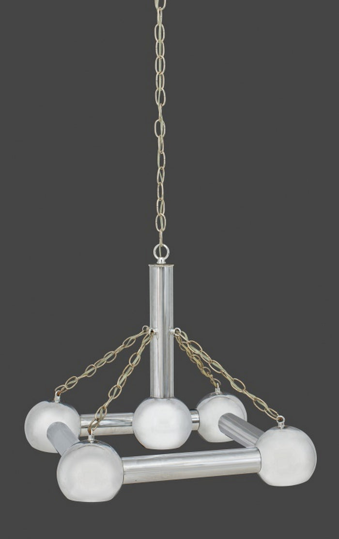 Gaetano Sciolari Style Tubular Chrome Five-Light Chandelier, circa 1970. 17.5" H x 20" W x 20" D. Provenance: From a New York City Collection. Keywords: Lighting, Pendant lamp, Hanging ceiling light, MCM, Mid-Century Modern, Modernist, Modernism, Vintage, Interior design, Decorative Arts