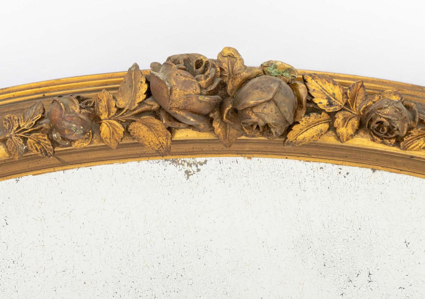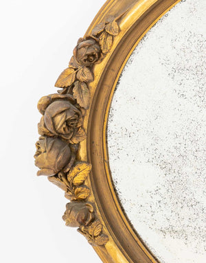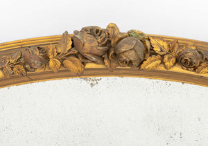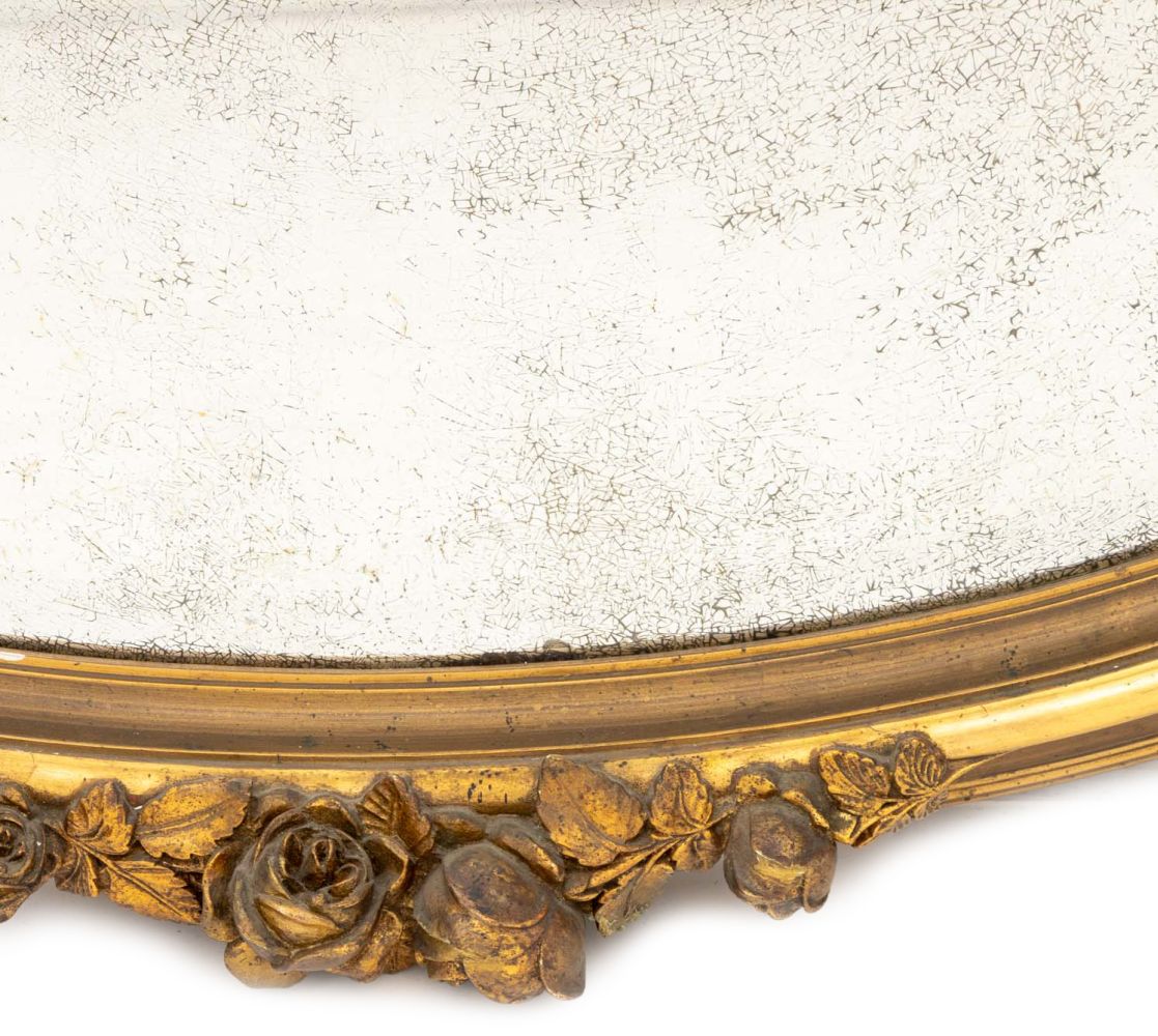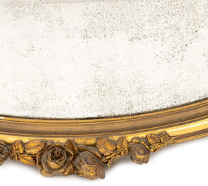 Gilded Age Rose Motif Gilt Composition Oval Beveled Glass Mirror. Mirror plate: 25.5" H x 39.5" W; 33" H x 47" W x 5" D. Provenance: From a New York City Collection. Keywords: Belle Epoque, Overmantel mirror, Looking glass, Vanity, Flowers, Floral design, Antique mirrors, Interior design, Decorative Arts
