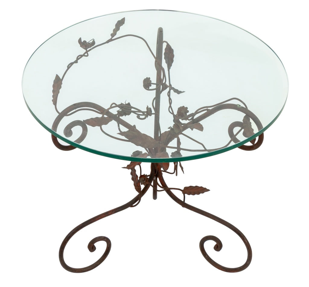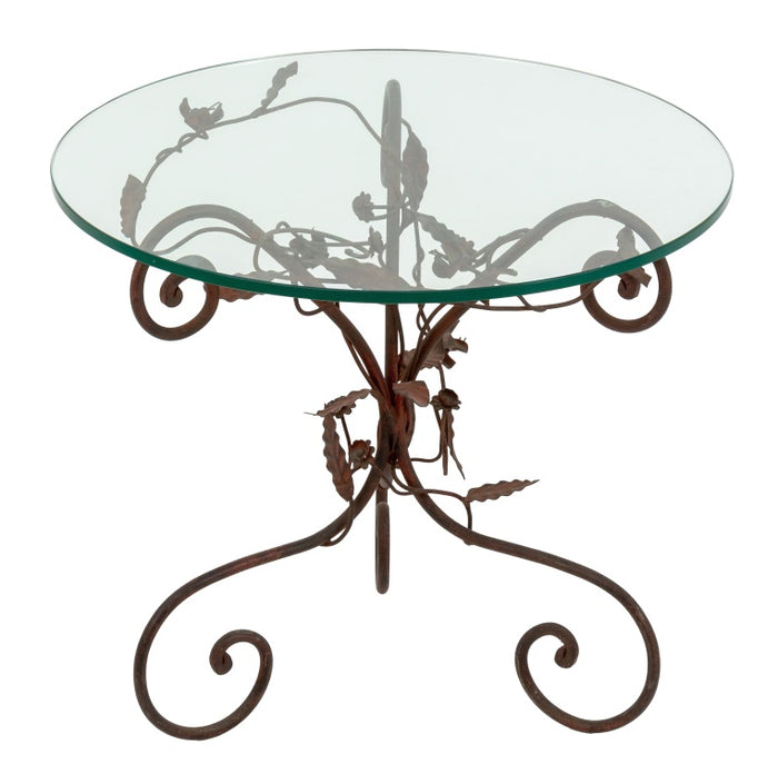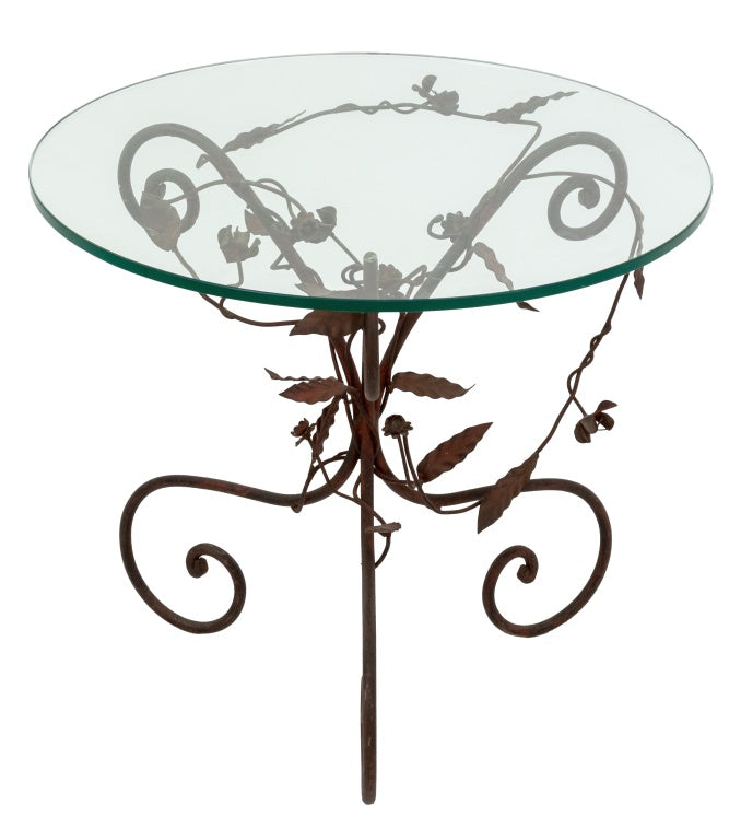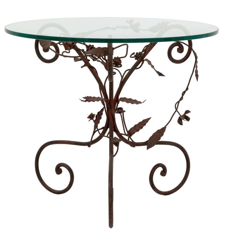 Glass-Topped Foliate Motif Red Painted Wrought Iron Side Table, circular glass top above three scrolled form supports. 17.5" H x 20" Diameter. Provenance: From an Upper East Side Collection. Keywords: Vintage Furniture, Foliage, Branches, Leaves, Leaf, End table, Accent table, Interior design, Decorative Arts