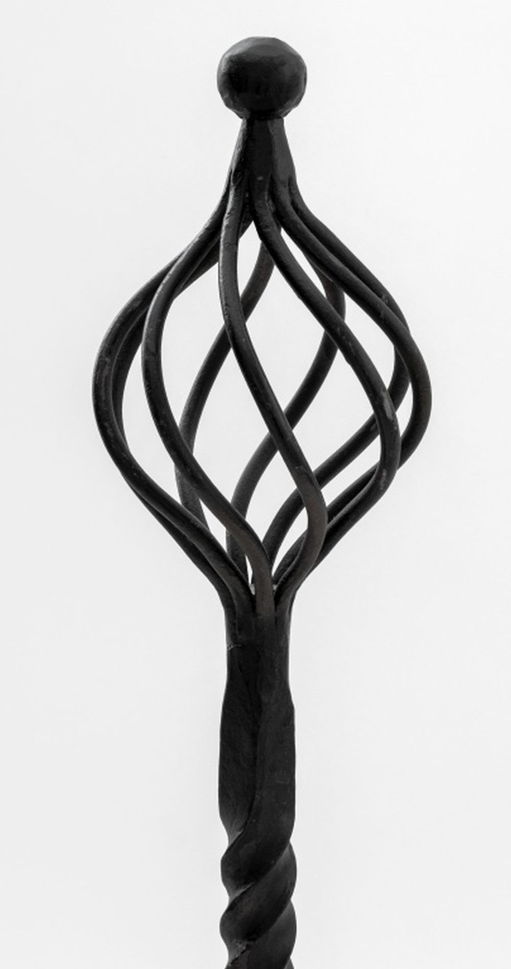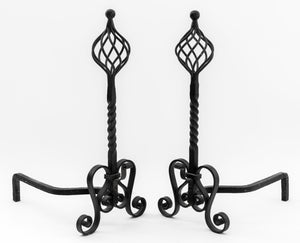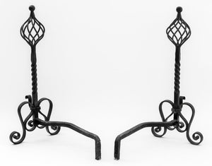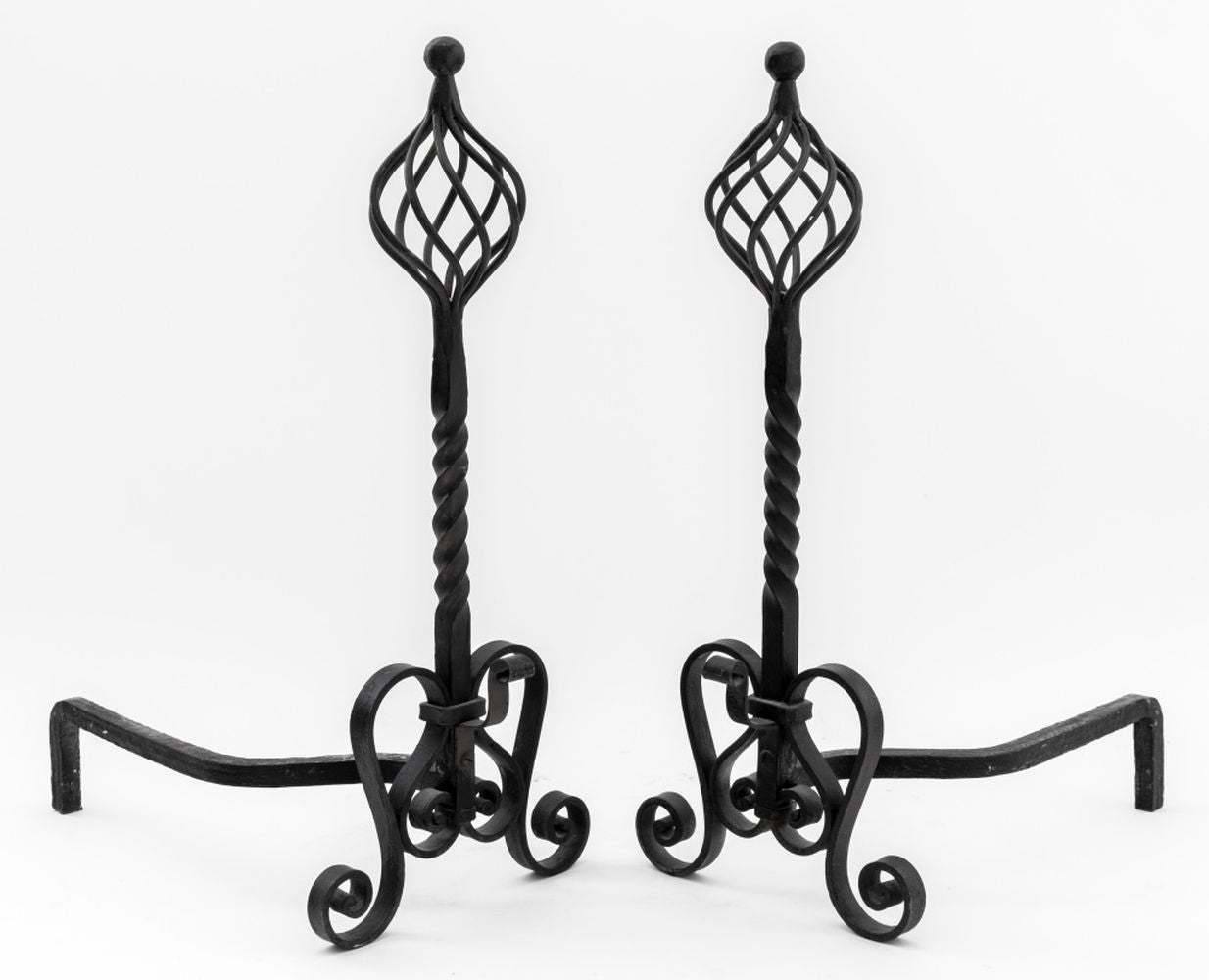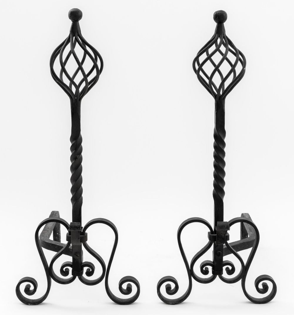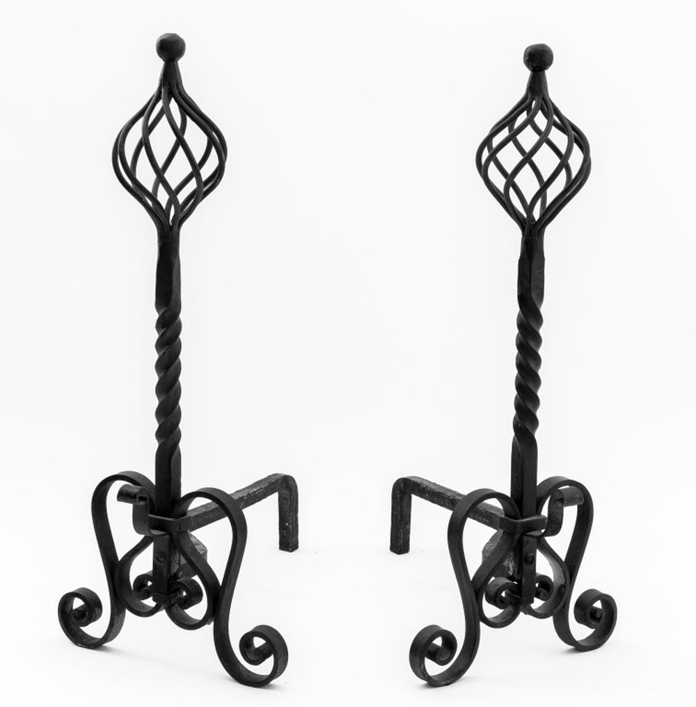 Pair of Gothic Revival Wrought Iron Andirons, with openwork twist finial and twist support on scroll form base. 24.25" H x 10" W x 17.5" D. Provenance: From a New York City Collection. Keywords: Fireplace accessories, Firedogs, Hearth, Dog-iron, Log holder, Interior design, Decorative Arts, Antique