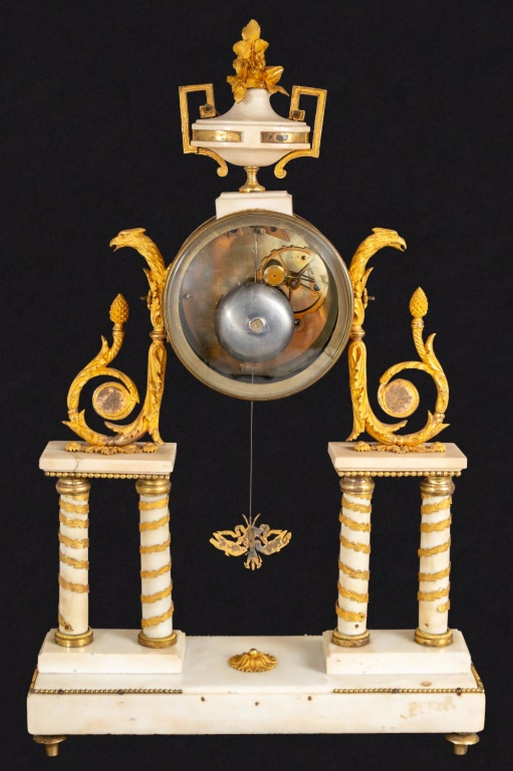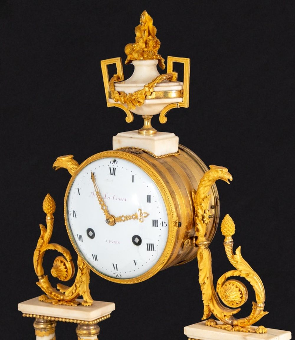 Louis XVI Style Ormolu Mounted White Marble Mantle Clock, 19th century, the circular white enamel barrel dial signed "Jacques LaCroix a Paris", the movement strike on bell, surmounted by an urn and supported by scrolled eagle supports, on portico columns and rectangular plinth with ball feet.