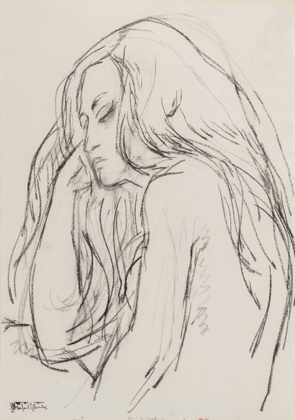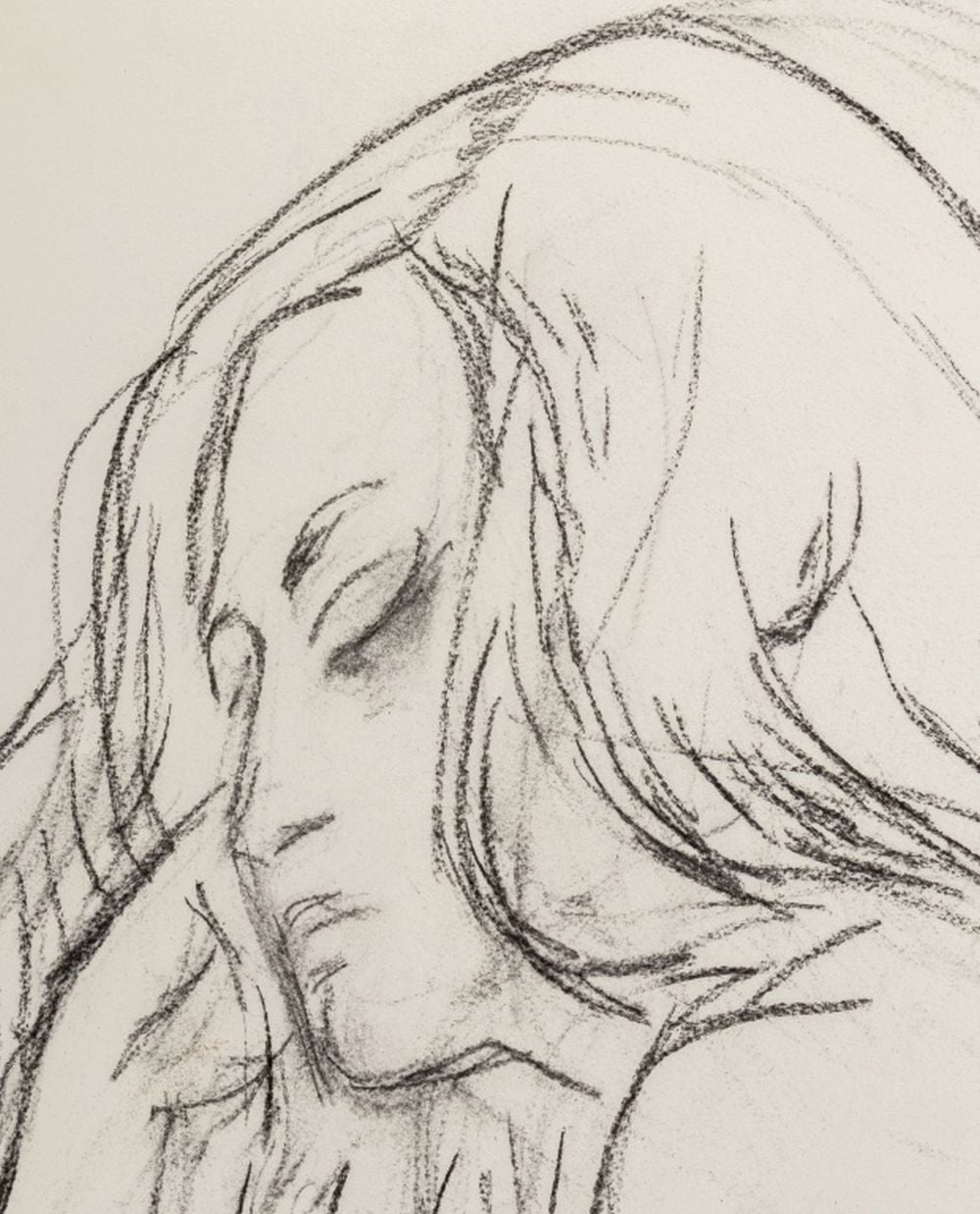 Manfred Schwartz (American, b. Poland, 1909-1970), Resting Nude Woman, Charcoal on Paper, with the artist's signature stamped lower left, unframed. 20" H x 14.25" W. Provenance: From a 35 East 75th Street Estate. Keywords: Drawing, Works on Paper, Model study, Female Figure, Figural, Figurative, Tired, Nap, Provincetown, P-town Artist, Post-War Art