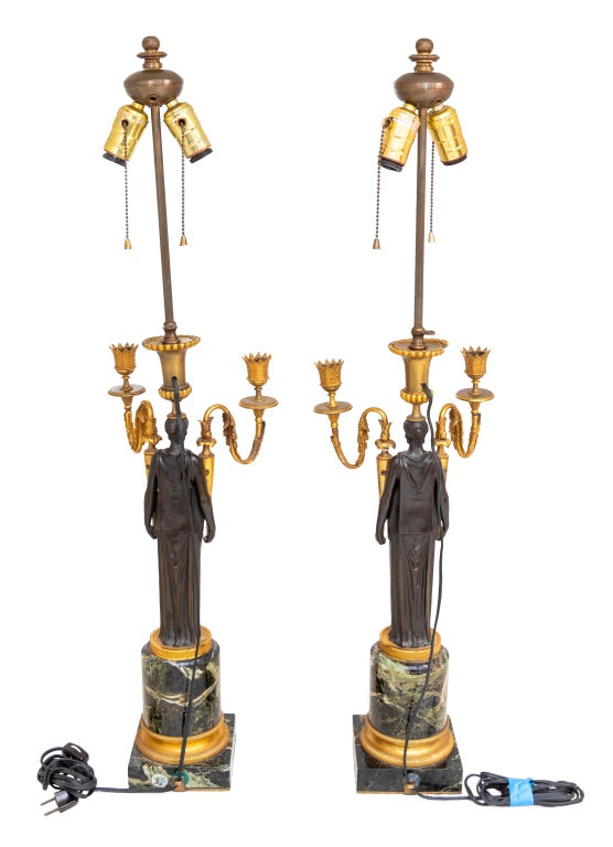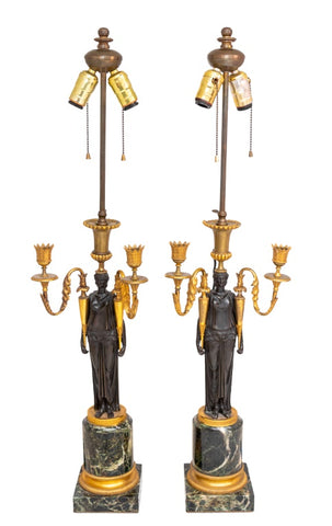 Pair of Restauration Bronze Figural Candelabra Lamps