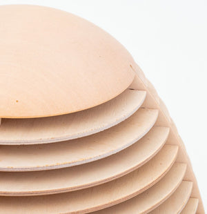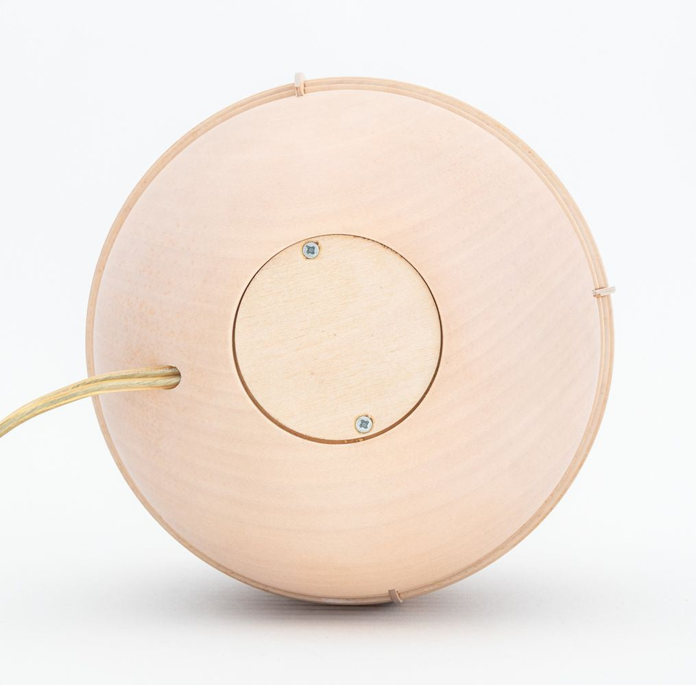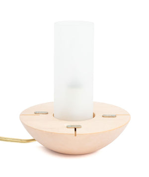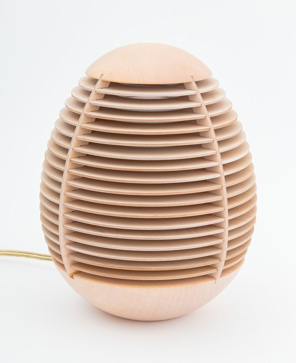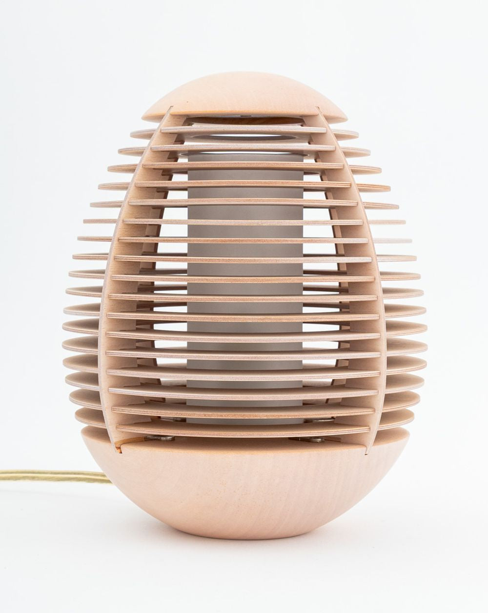 Penta "Tocco" Wood Table Lamp, egg shaped in oak wood and glass shade insert. 9" H x 7.5" Diameter. Provenance: From a Vintage Collection of Italian Designer Furniture Samples. Keywords: Lighting, Postmodern Design, Minimalist Modern, Space Age Style, Lighting, Ambiance Light, Italian Designer, Decorative Arts