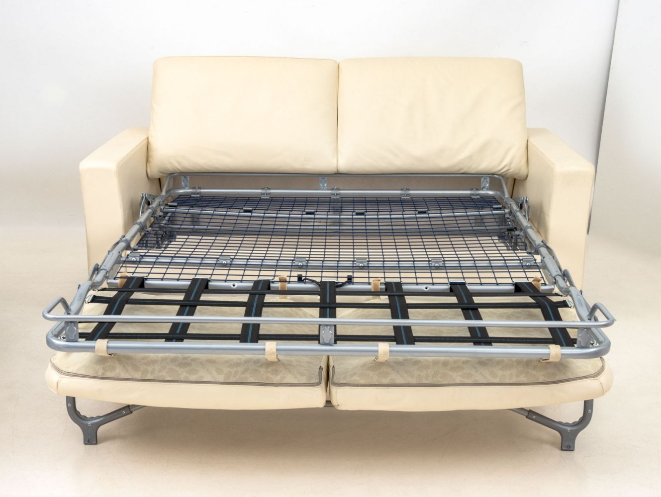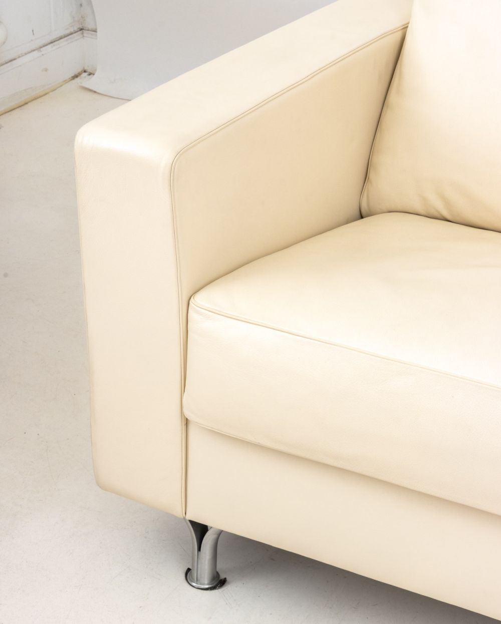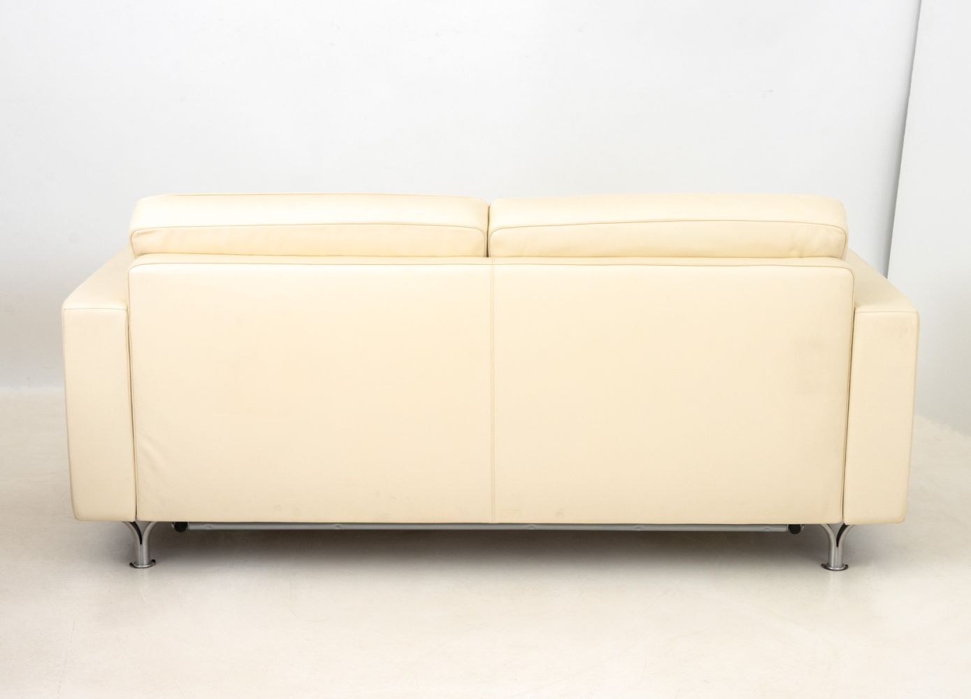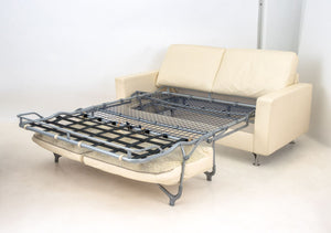 Poltrona Frau White Leather Sleeper Sofa, with twin size pull-out bed on four chrome feet, with "Poltrona Frau / Made in Italy" label to the interior. 34" H x 76" W x 37" D; seat: 18.5" H; bed: 79" L x 57" W. Provenance: From a 30 West 63rd Street Collection. Keywords: Italian Furniture, Contemporary Furniture, Designer, Seating, Couch, Bedding, Interior design, Decorative Arts