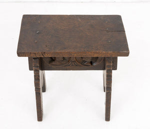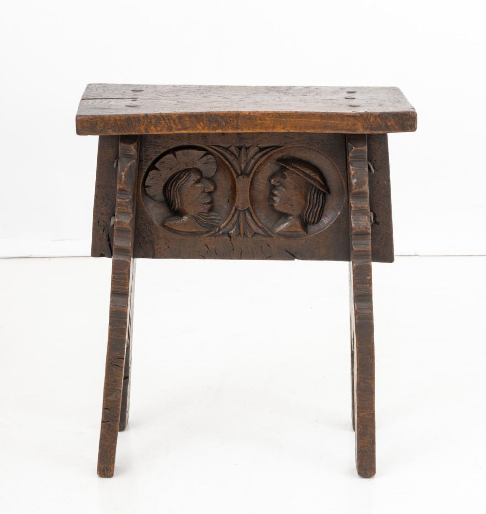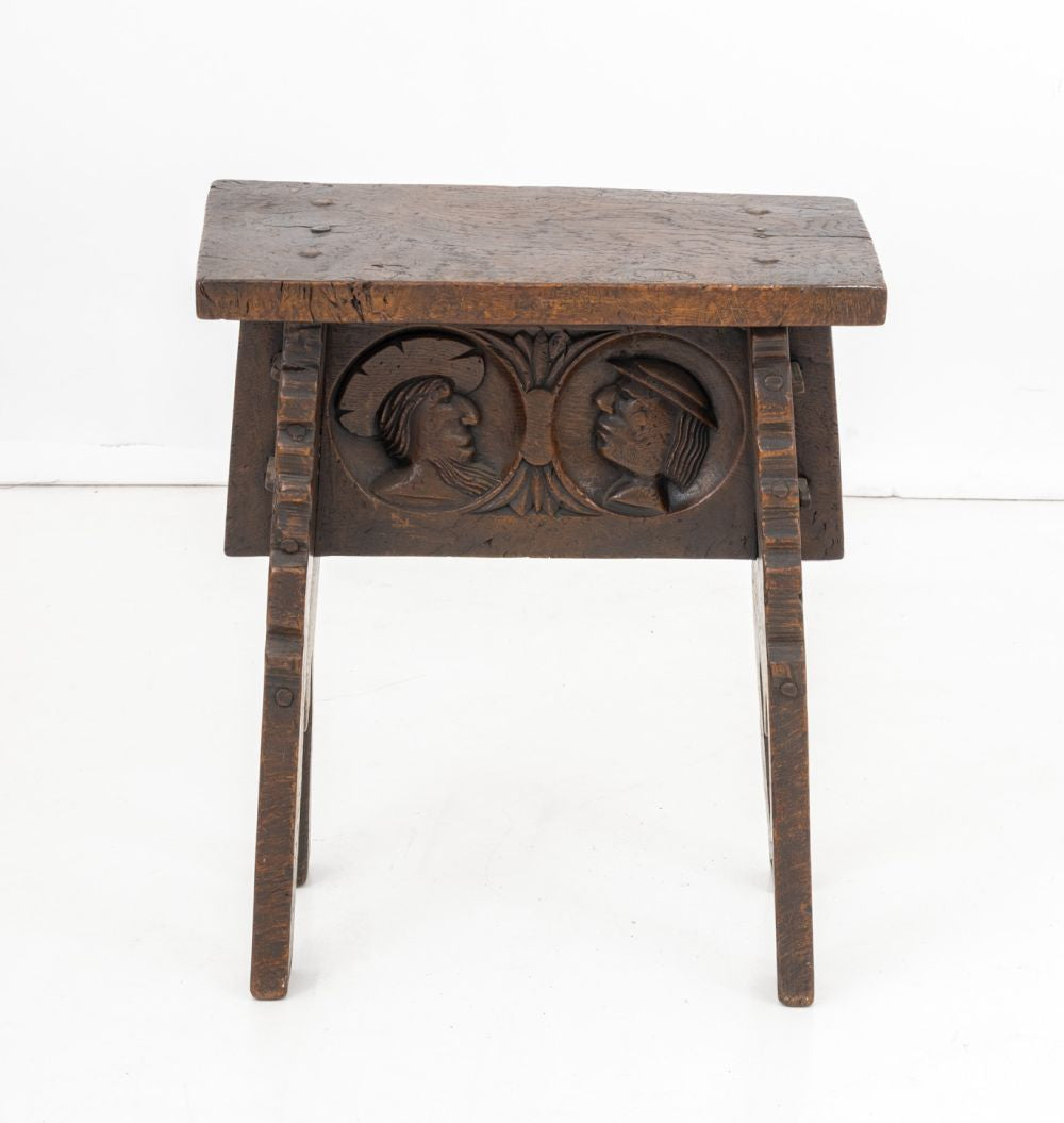 English Renaissance Revival Oak Stool, early 19th century, with rectangular top above carved double-sided couple medallion portrait with two shaped supports. 22.5" H x 19.75" W x 10.75" D. Provenance: From a New York City Collection. Keywords: Antique Furniture, Seating, Chair, Carving, Portraiture, Figural, Figurative, Rustic, Country, Provincial, Interior design, Decorative Arts
