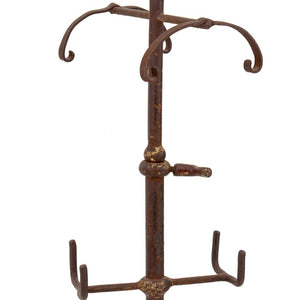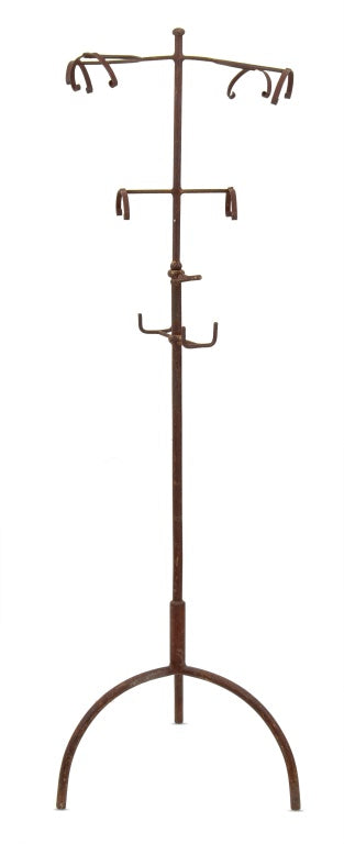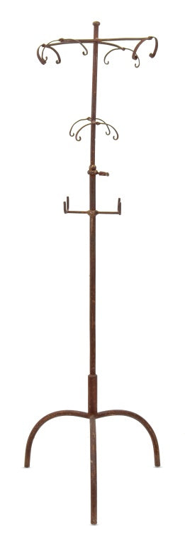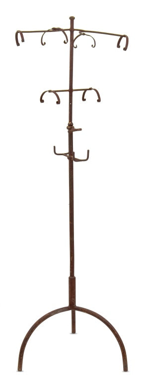 Wrought Iron Adjustable Coat Rack, early 20th century, on three spider legs. 66" H x 23" W x 21" D.  Provenance: From a 50 Central Park West Estate. Keywords: Furniture, Coat tree, Coat hanger, Free standing, Home accents, Furnishings, Interior design, Decorative Arts, Vintage Furniture